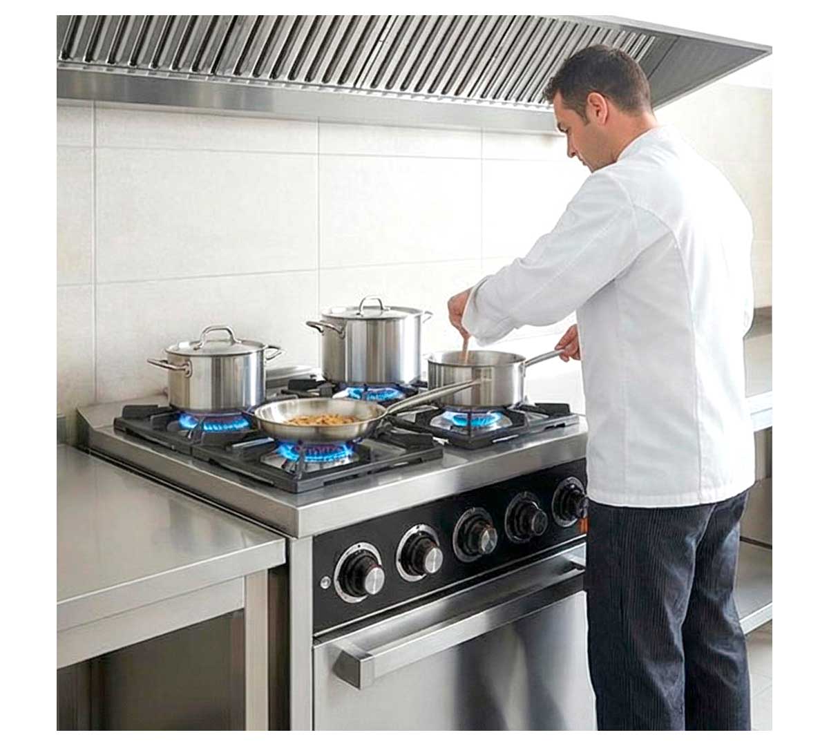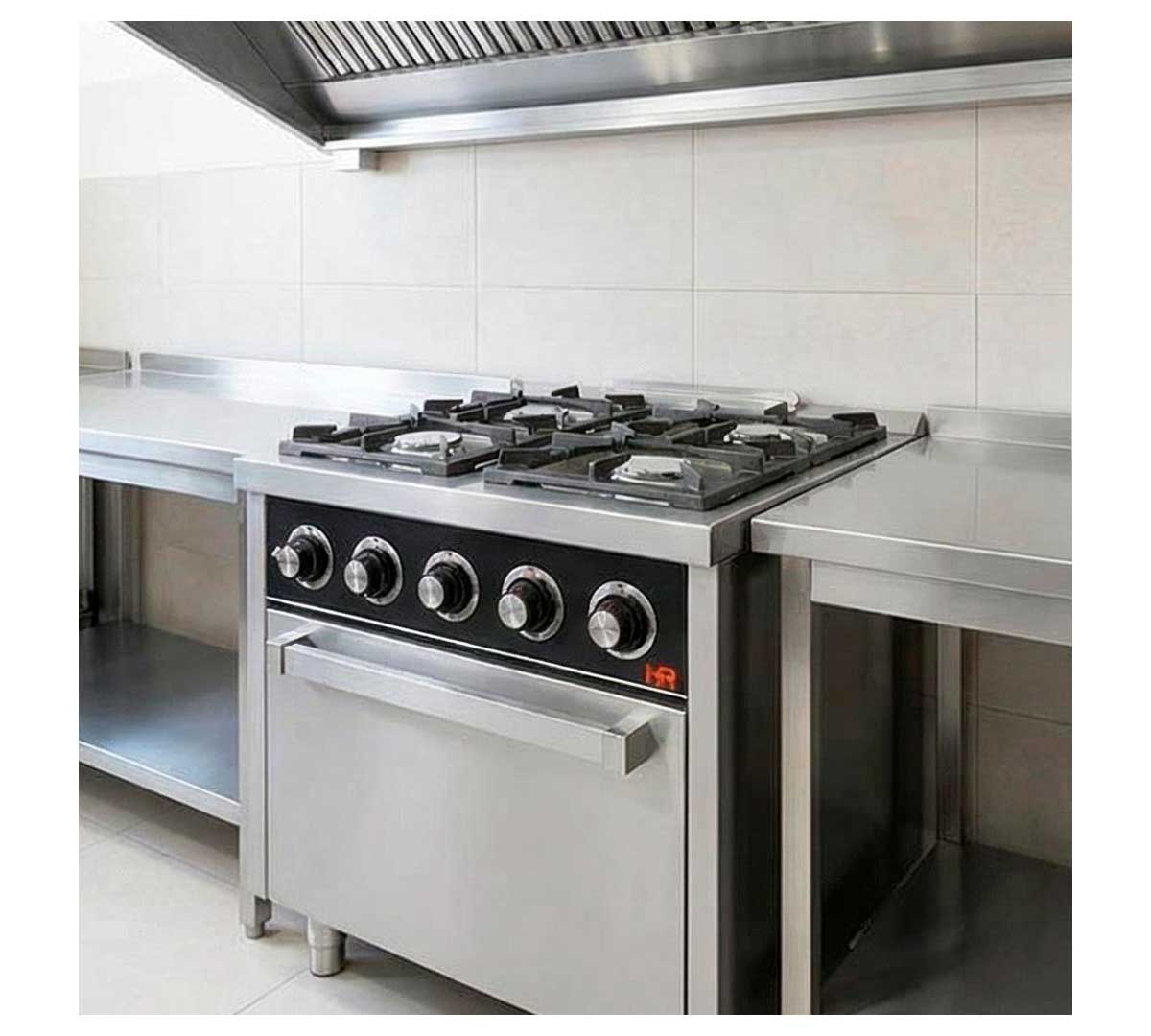 Este bloque de cocción está especialmente indicado para cocinas de restaurantes, hoteles y colectividades que requieren una cocina de gas con horno capaz de soportar un uso intensivo y continuo. Su diseño permite preparar simultáneamente diferentes elaboraciones, desde guisos y salteados en los fuegos hasta asados y horneados en el horno, optimizando el espacio y los tiempos de trabajo.