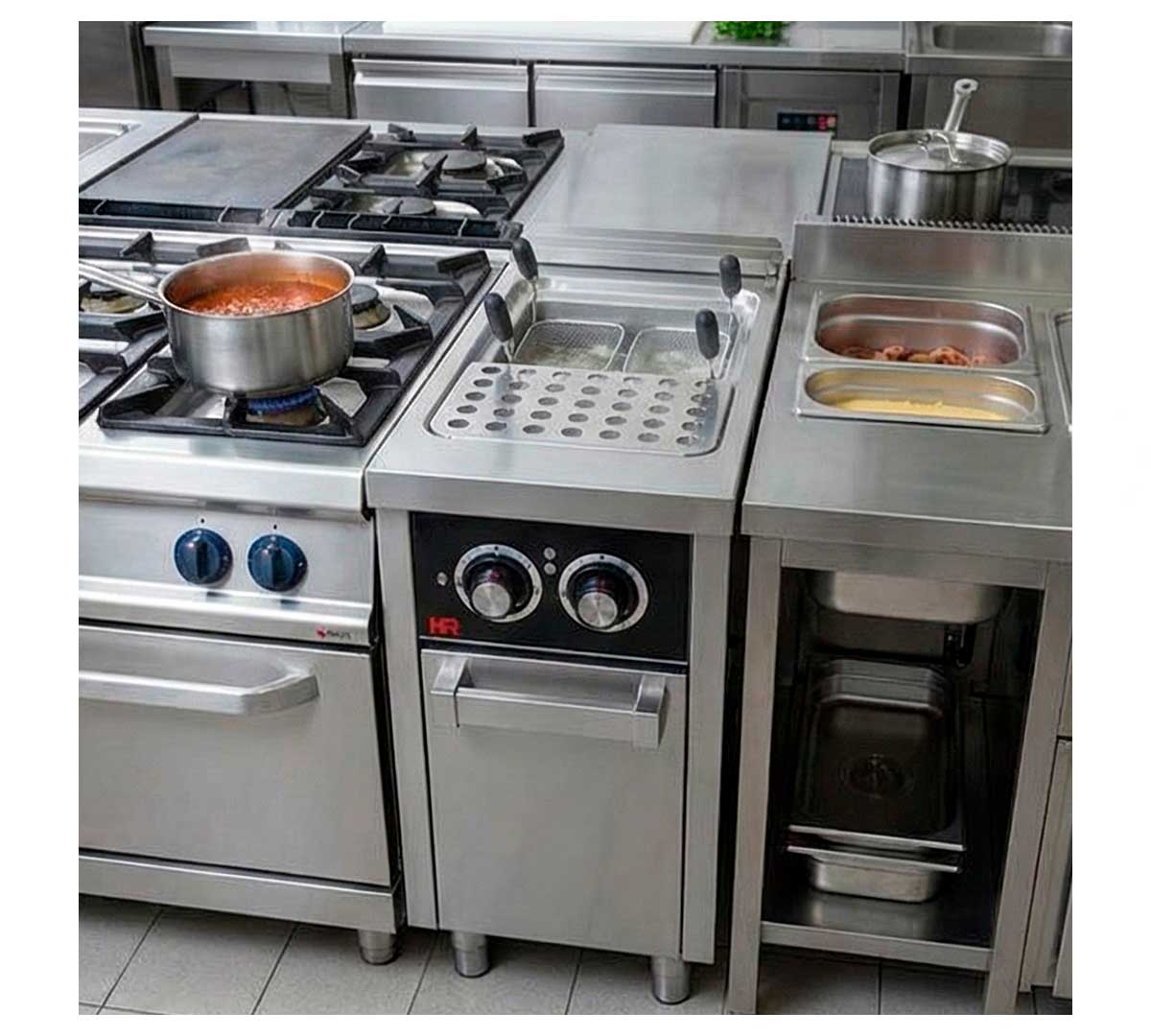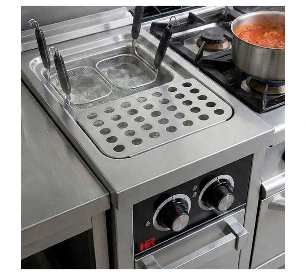 Este cuece pastas es perfecto para cocinas que requieren hervir grandes cantidades de pasta, arroz, verduras o alimentos similares de forma rápida y homogénea. Su diseño lo hace especialmente adecuado para restaurantes, comedores, caterings y cualquier entorno donde la eficiencia y la seguridad sean prioritarias.