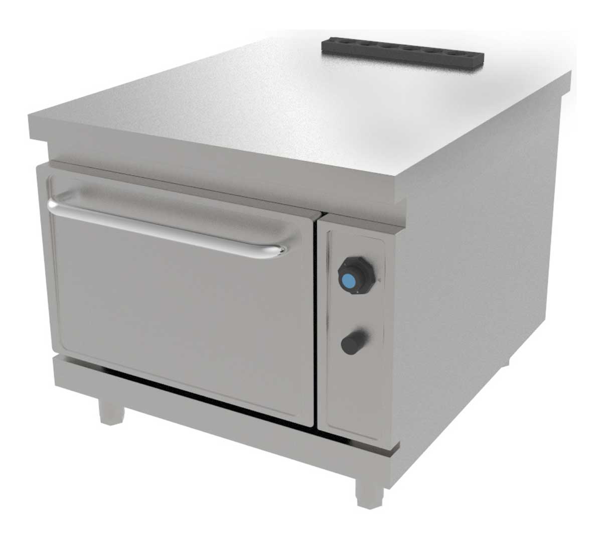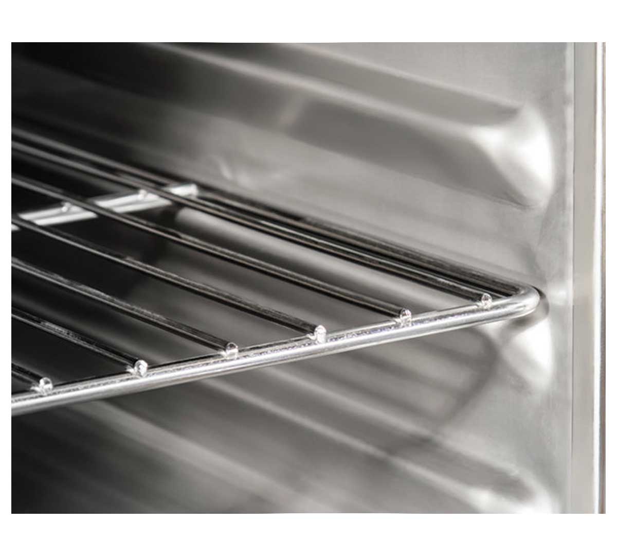 Horno a gas de gran capacidad. Fabricado en acero inoxidable. Con guías embutidas para bandejas GN 1/1 y base de hierro fundido. Incorpora encendido piezoeléctrico y control termostático.