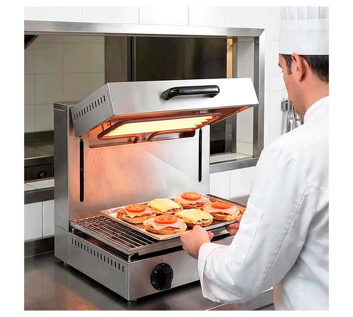Gratinador eléctrico de acero inoxidable con techo móvil para gratinar o asar. Tiene un ancho de 40 a 80 cm, dependiendo del modelo. Resistencia tubular con facilidad de limpieza. Control de temperatura mediante regulador de energía.