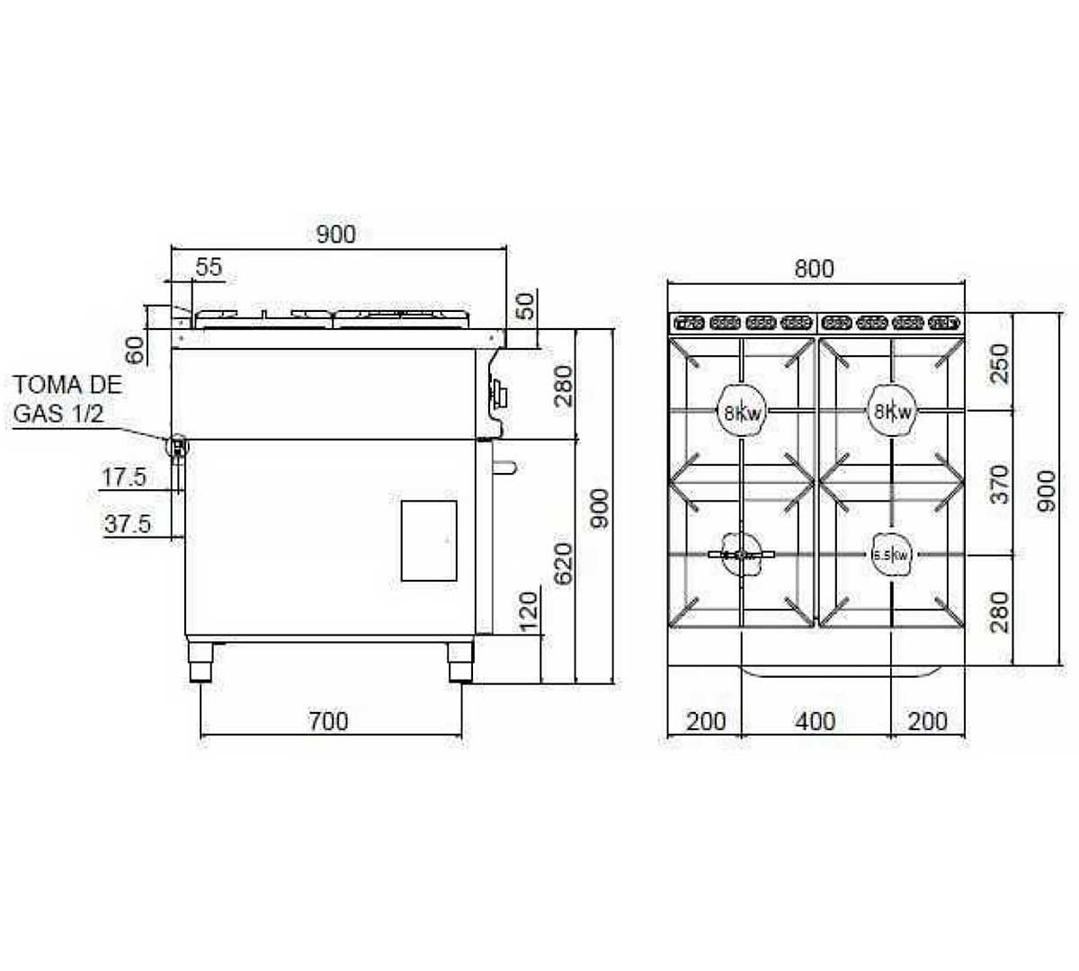 4 Fogones. Potencia 2x6,5 + 2x8 kW