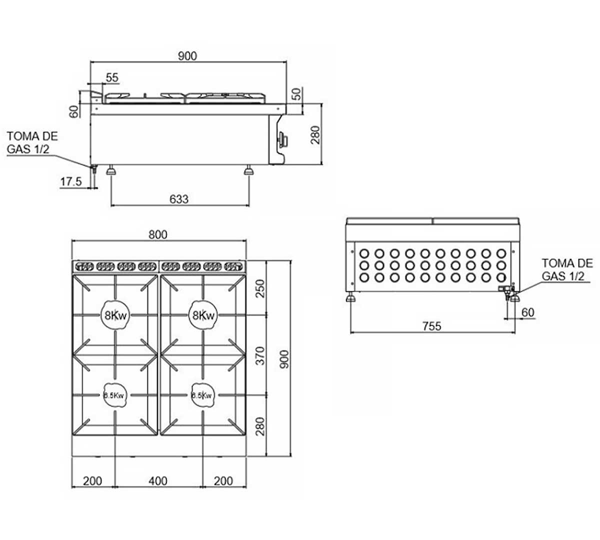 Cocina de sobremesa con encimera de 2 mm de espesor. Está fabricada en acero inoxidable, con encimera compuesta de cuatro fuegos abiertos de gran potencia. Dispone de piloto de encendido, válvula de seguridad y termopar.