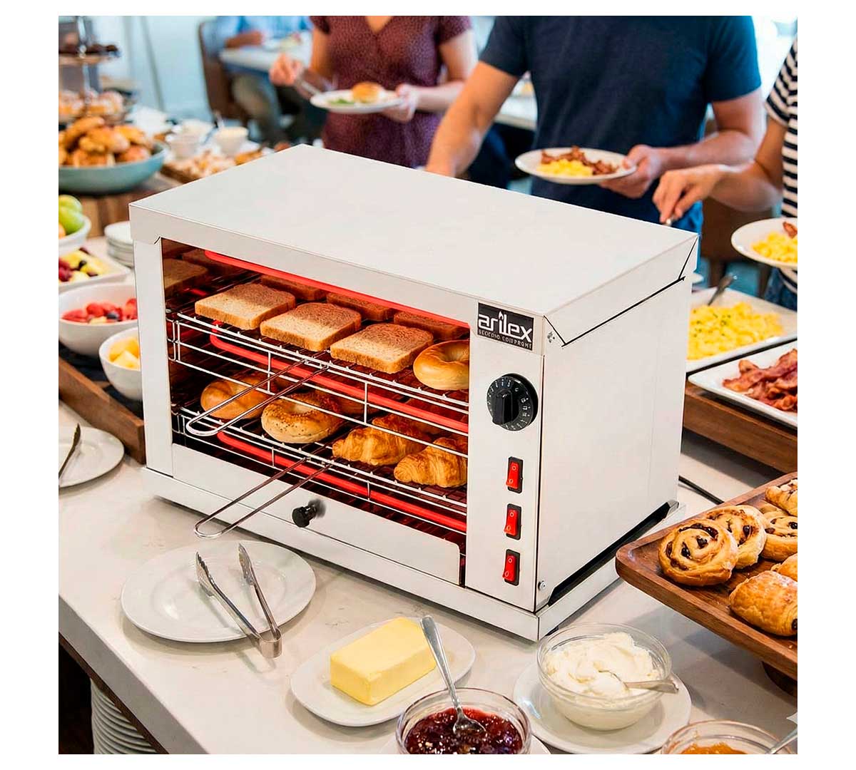El Tostador Eléctrico 2DUOT de Arilex está fabricado en acero inoxidable con acabado satinado. Las resistencias son blindadas y tiene dos niveles. Incluye temporizador.