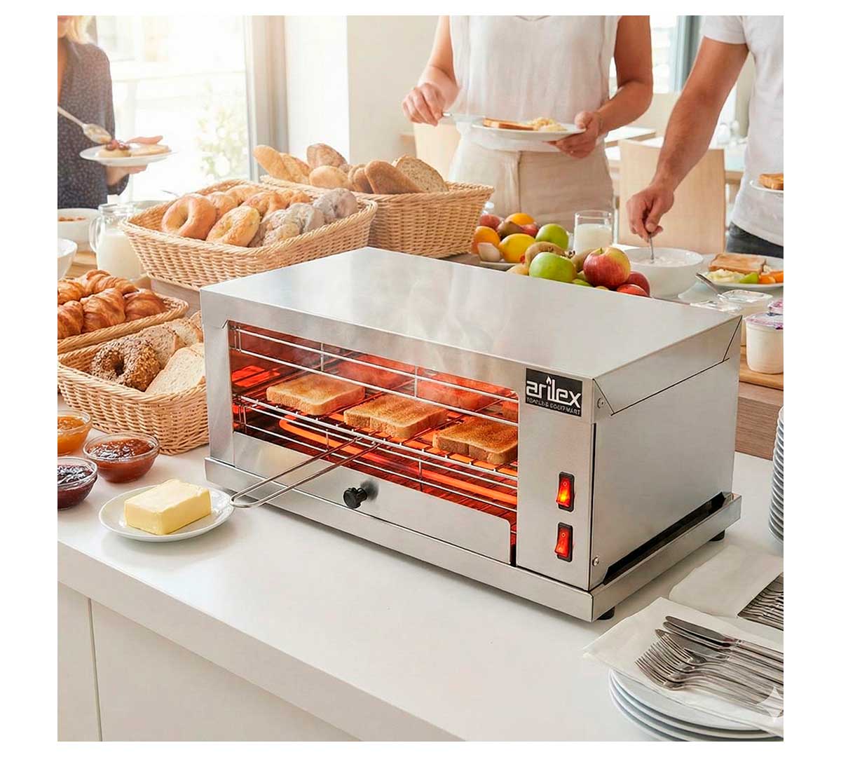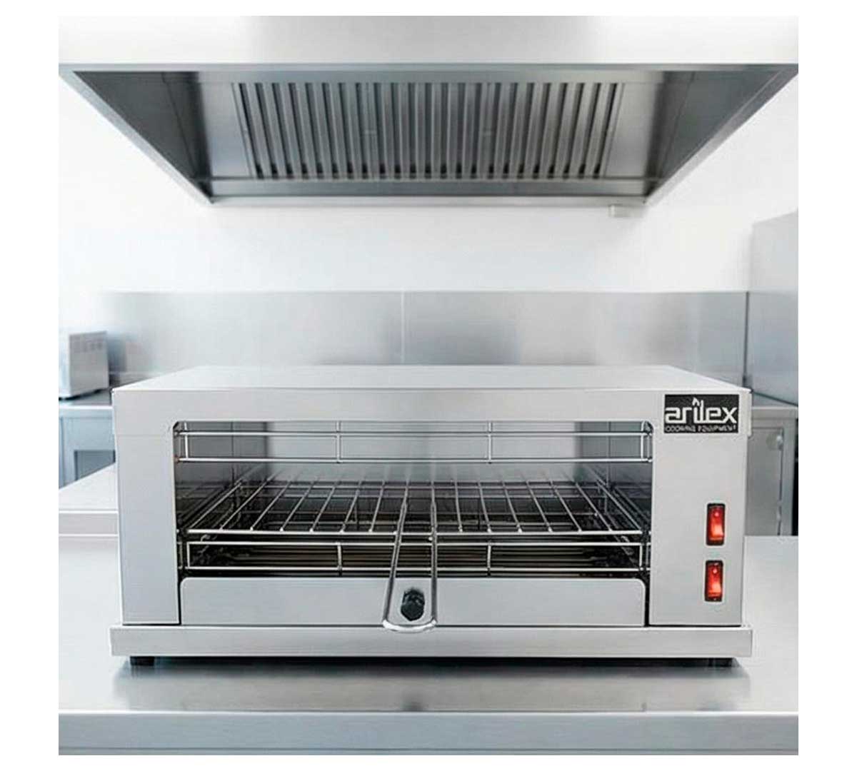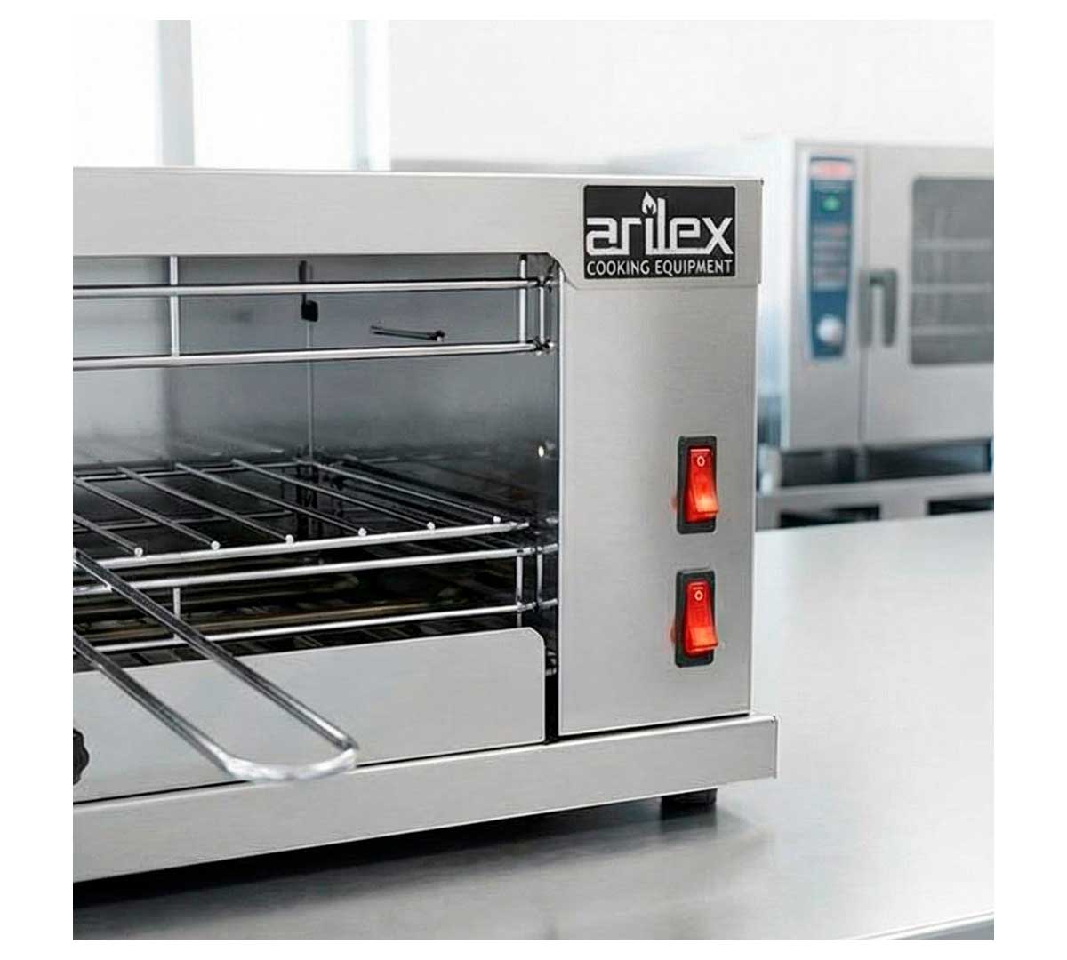 El Horno Tostador Eléctrico 1DUO de Arilex está fabricado en acero inoxidable con acabado satinado. Las resistencias son blindadas.