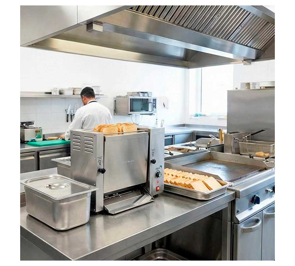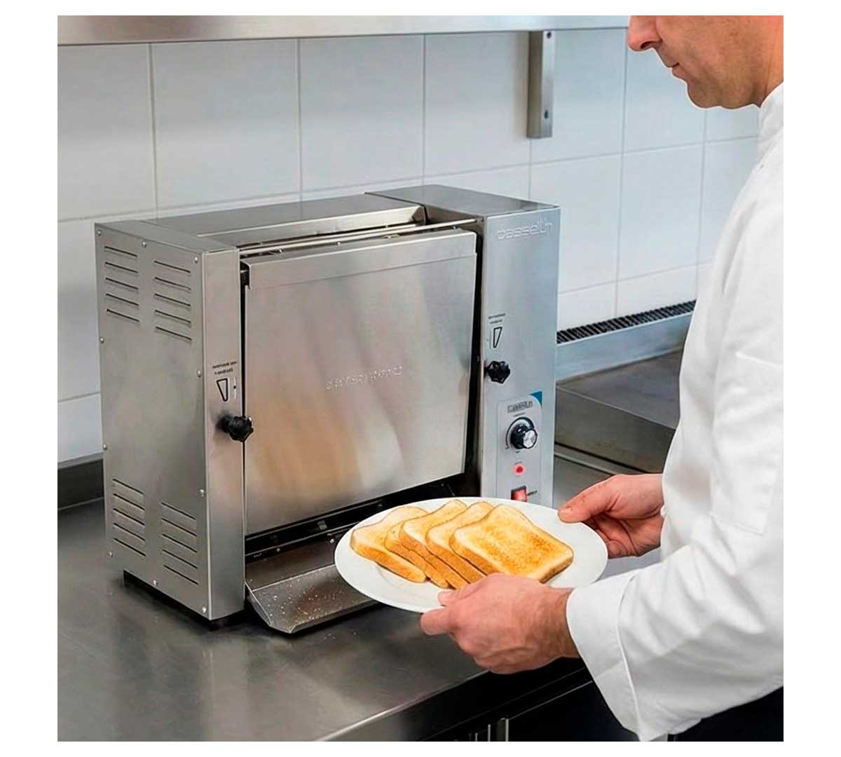 Tostador vertical fabricado un diseño ergonómico y resistencias controladas con termostato. Su producción es de 1200 tostadas por hora.