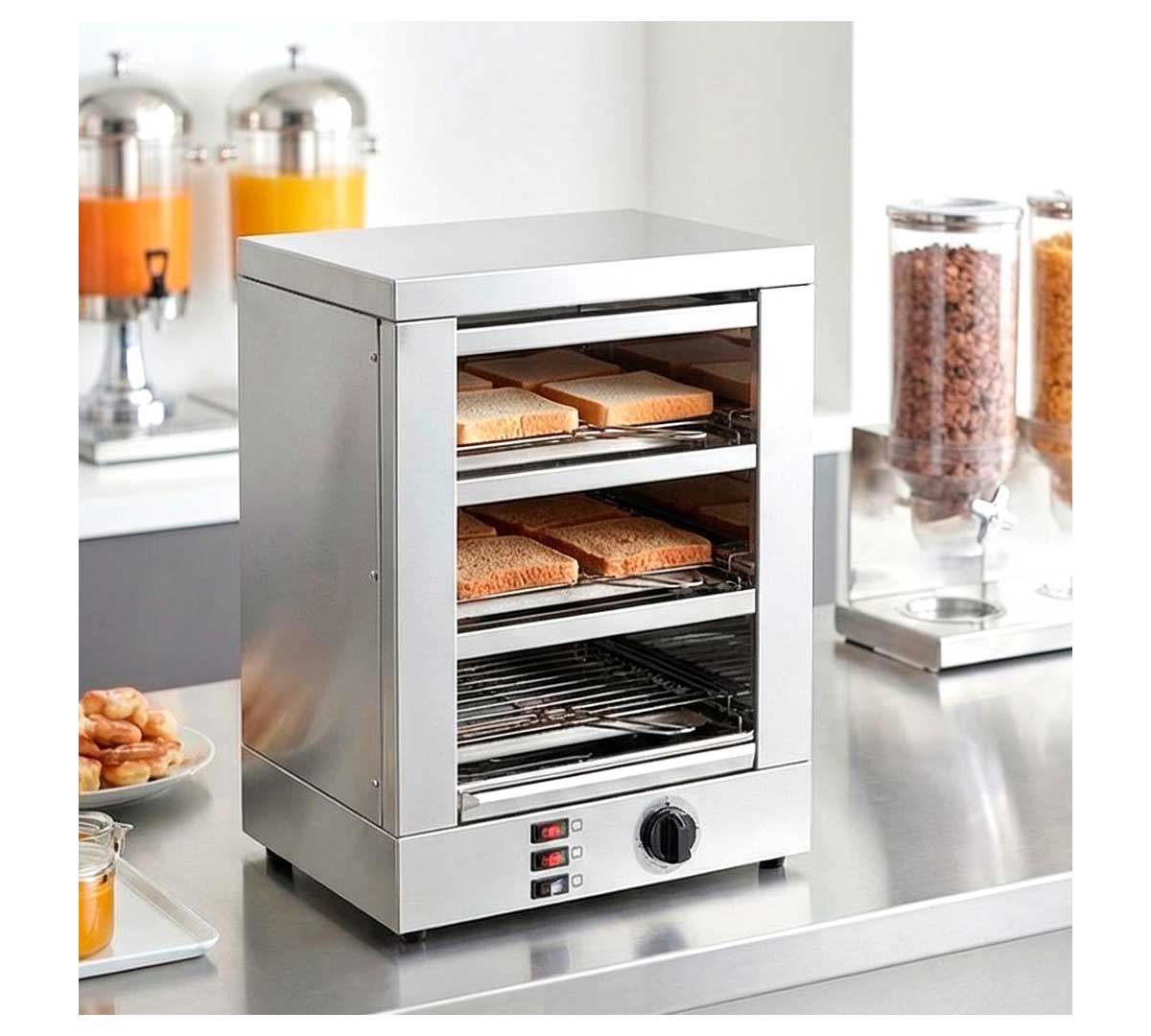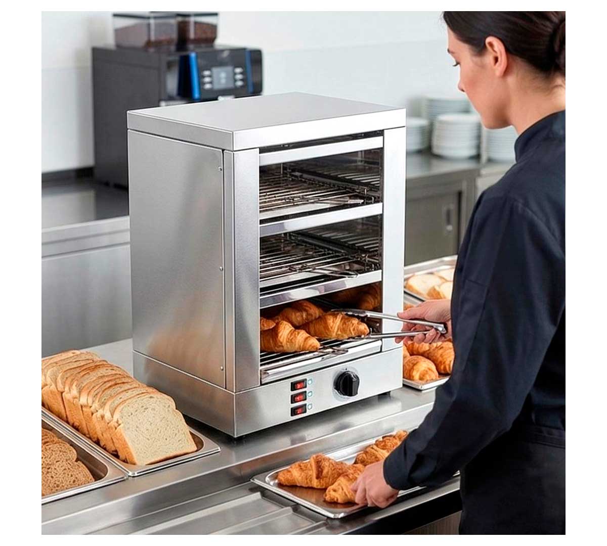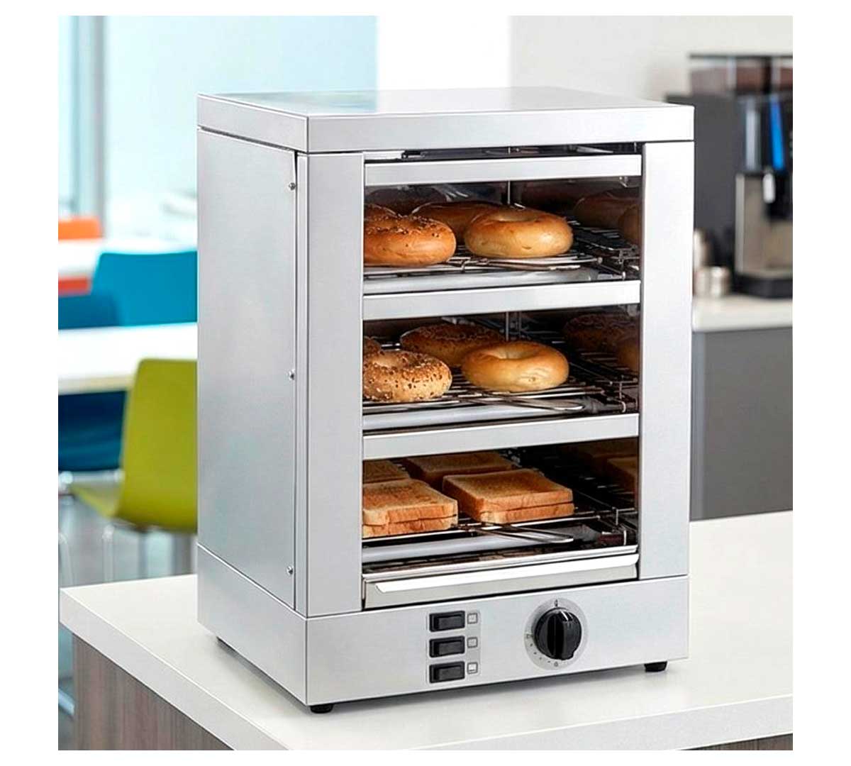 Tostadora con tres niveles diseñada para dar servicio de desayuno en hoteles, comedores, cafeterías, oficinas y buffets. Las resistencias son de cuarzo. Con interruptores luminosos para el funcionamiento de resistencias por niveles. Así se consigue un ahorro importante de consumo. Incluye temporizador.
