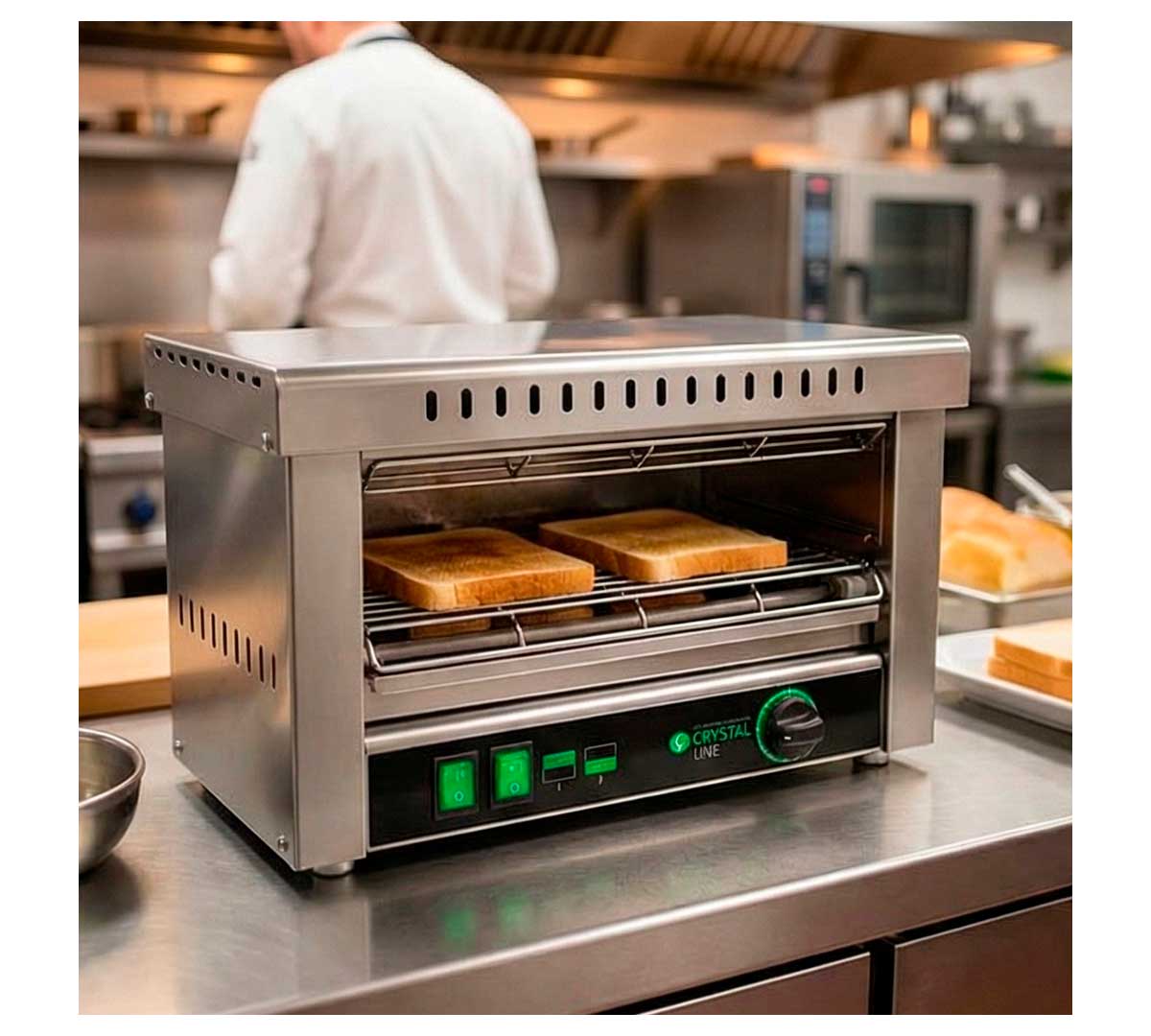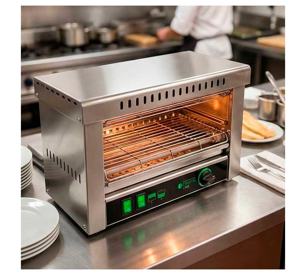 Tostador de un nivel y con temporizador de hasta 15 minutos. Está disponible con las resistencias blindadas o de cuarzo. La parrilla es extraible. Diseñada para dar servicio de desayuno en hoteles, comedores, cafeterías, oficinas y buffets.