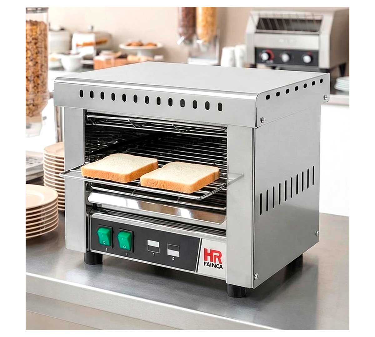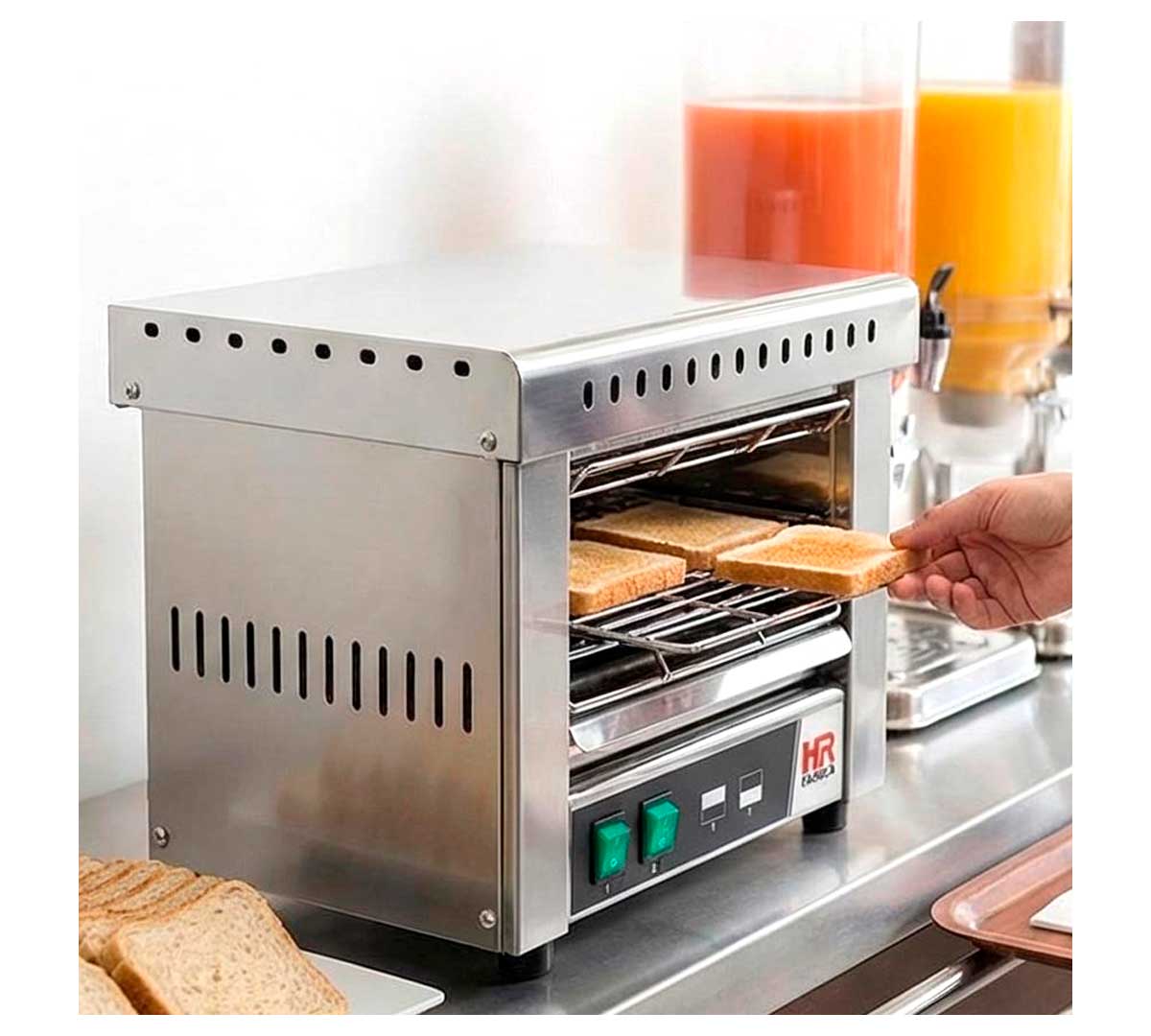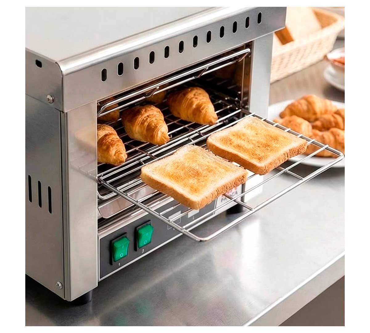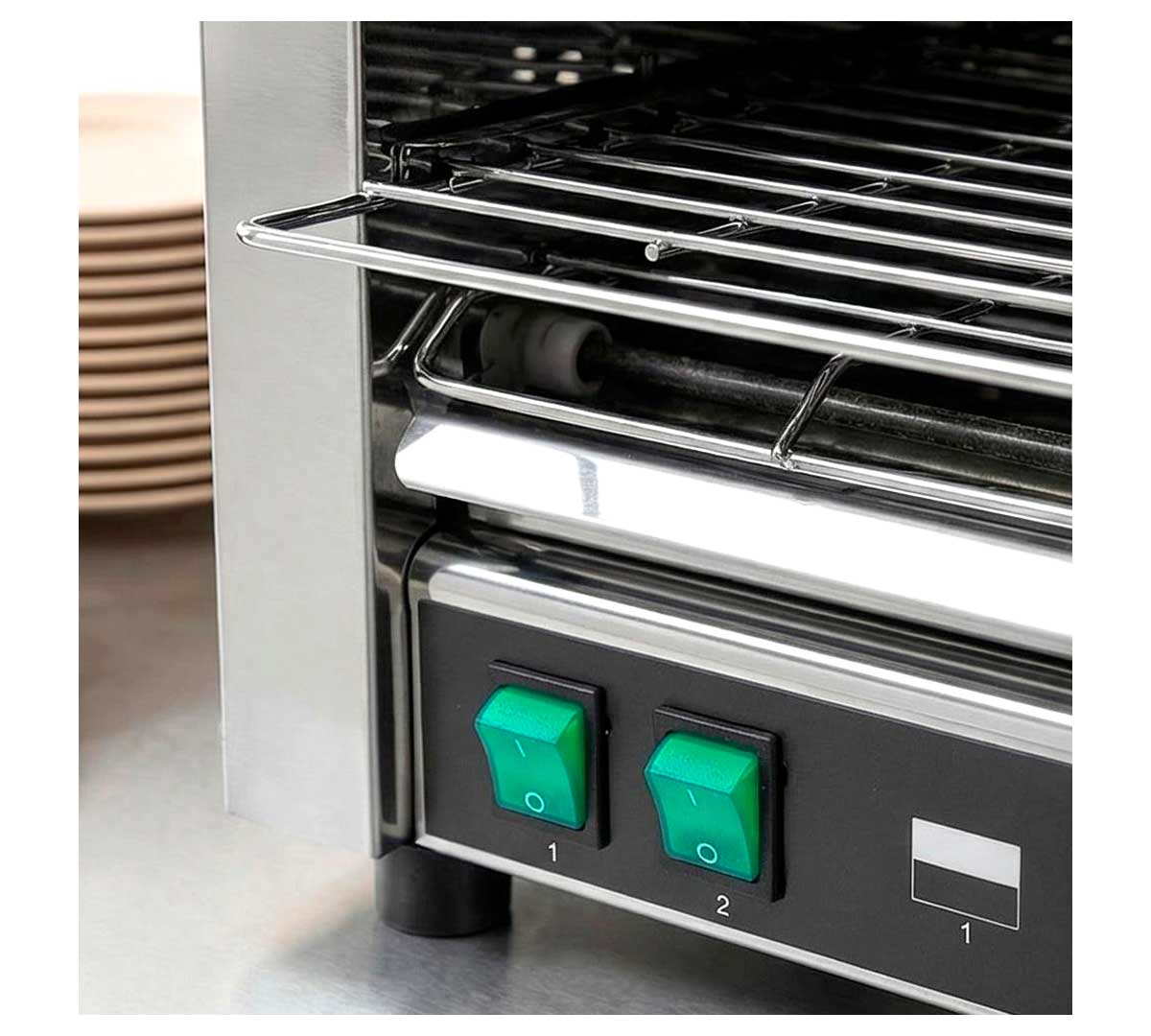 Tostadora con un nivel y sin temporizador. Diseñada para dar servicio de desayuno en hoteles, comedores, cafeterías, oficinas y buffets. La resistencia es blindada. La parrilla es extraible.
