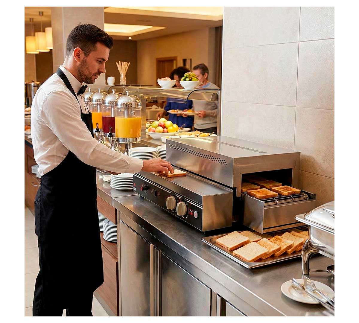 Tostador de cinta horizontal profesional. Fabricado en acero inoxidable. De gran capacidad, permite una producción de 650 tostadas/hora. Ideal para hoteles y restaurantes.