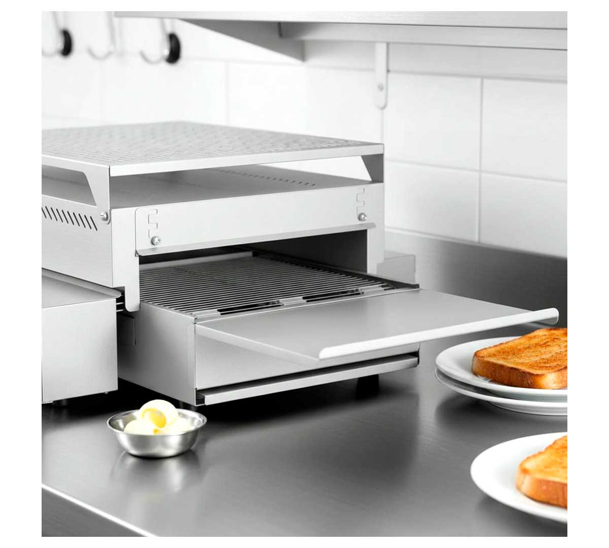 Tostadora de túnel horizontal profesional de gran capacidad y producción. Dispone de velocidad de avance regulable. Con bandeja inferior extraíble y bandeja superior calientaplatos.