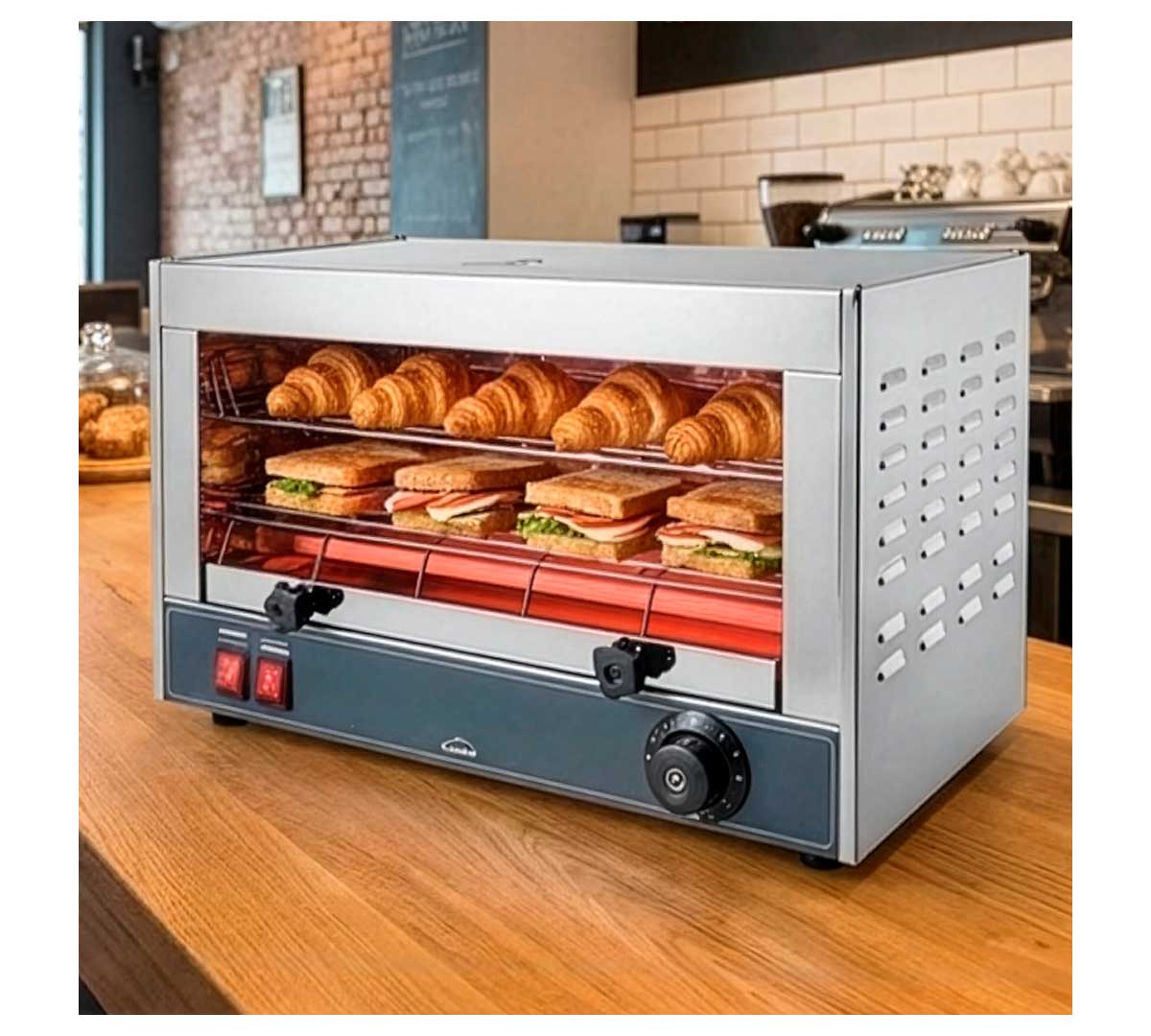 Tostadora con dos niveles fabricada en acero inoxidable. Tiene 9 lámparas infrarrojas halógenas de cuarzo. Equipada con bandeja recoge migas. Incluye temporizador.