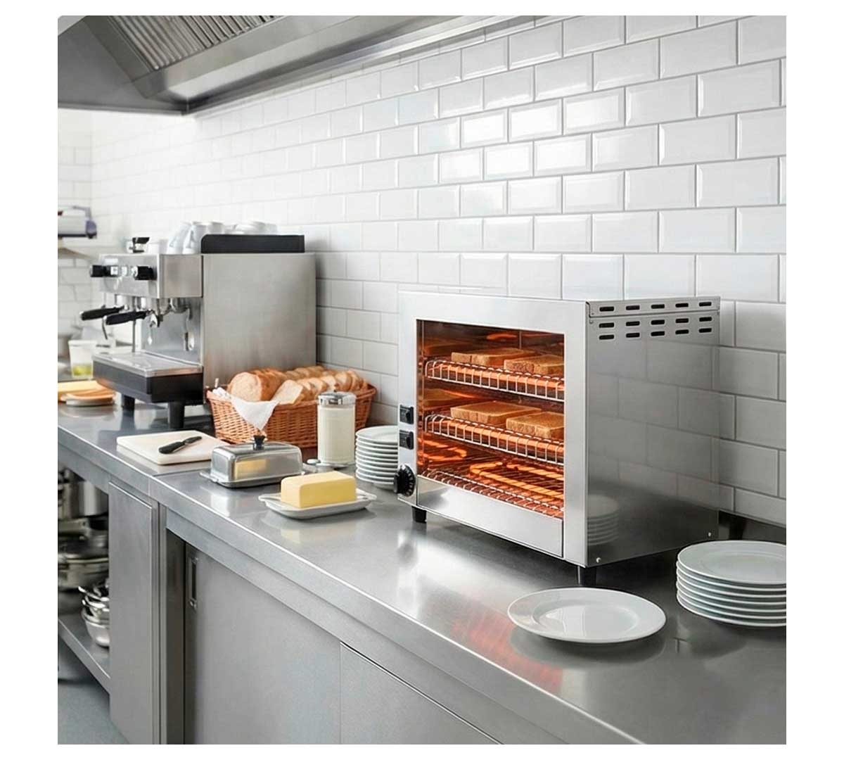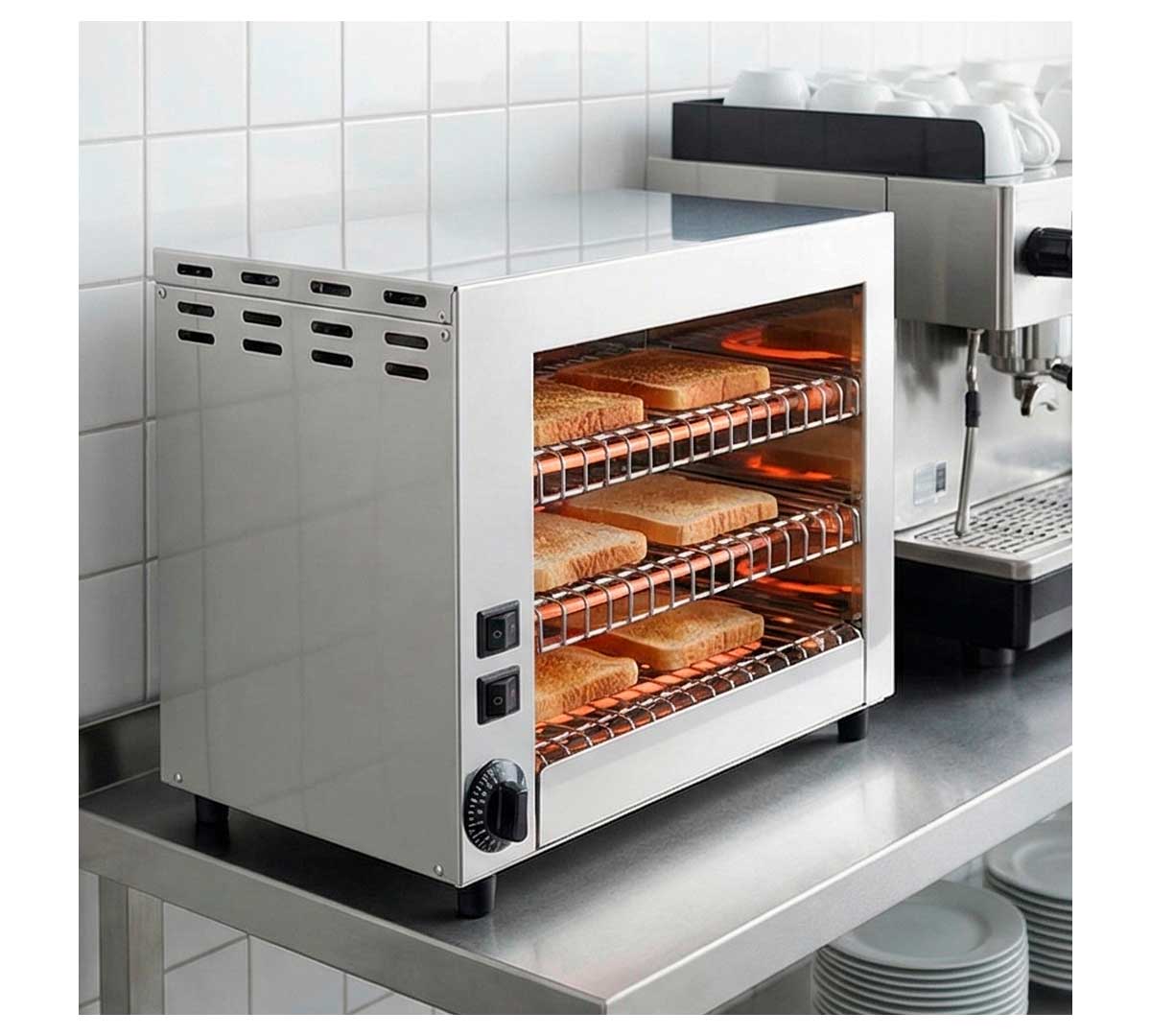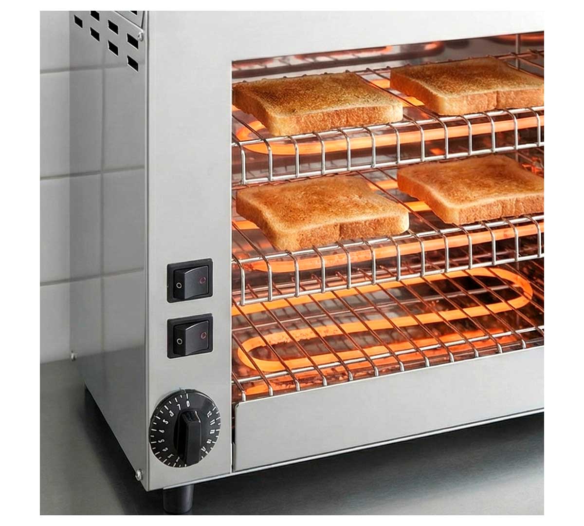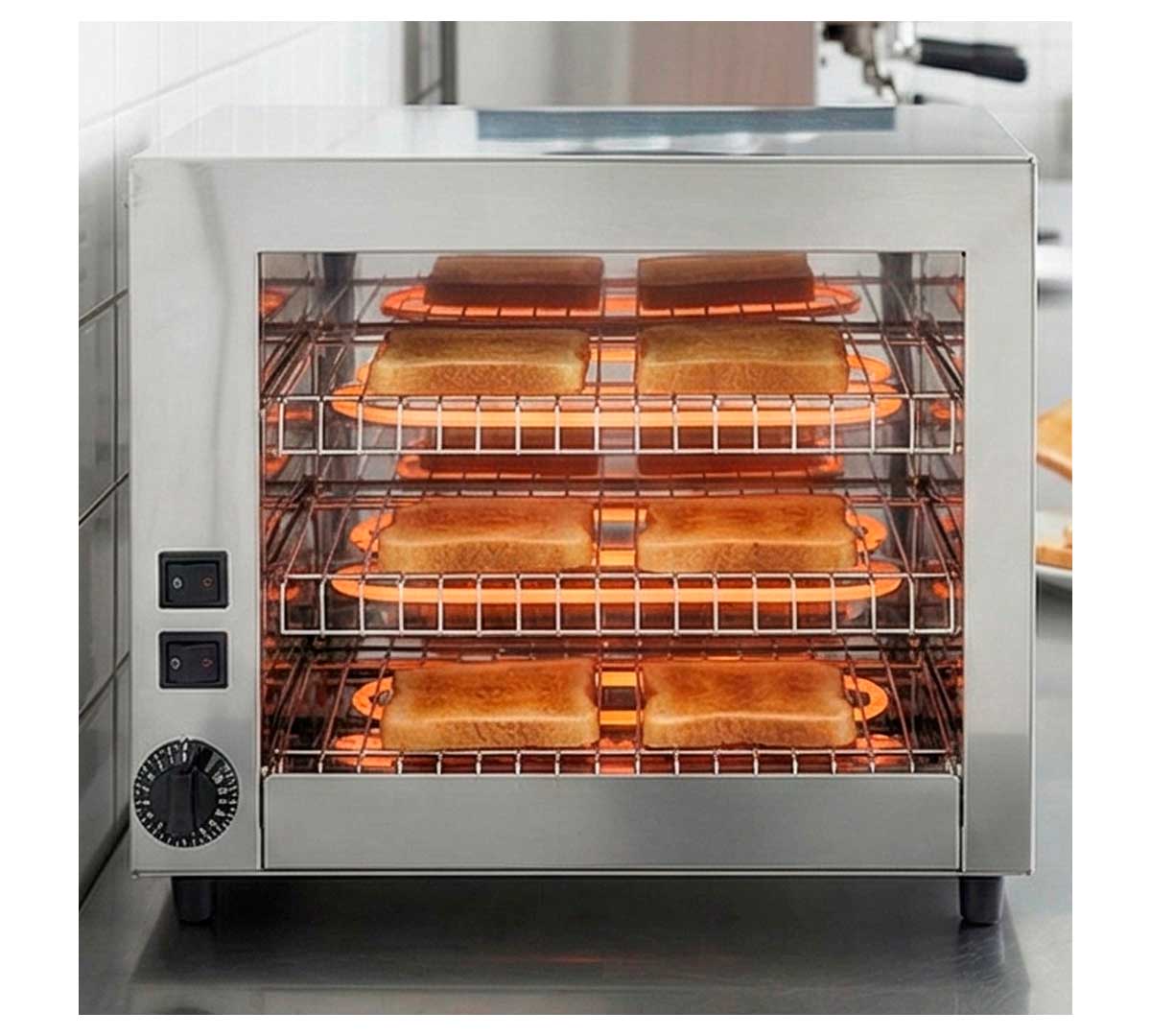 Tostador con tres niveles diseñado para calentar, tostar, cocinar o asar. Las resistencias son blindadas. Con estructura de acero inoxidable. El alto de boca es de 6,5 cm.