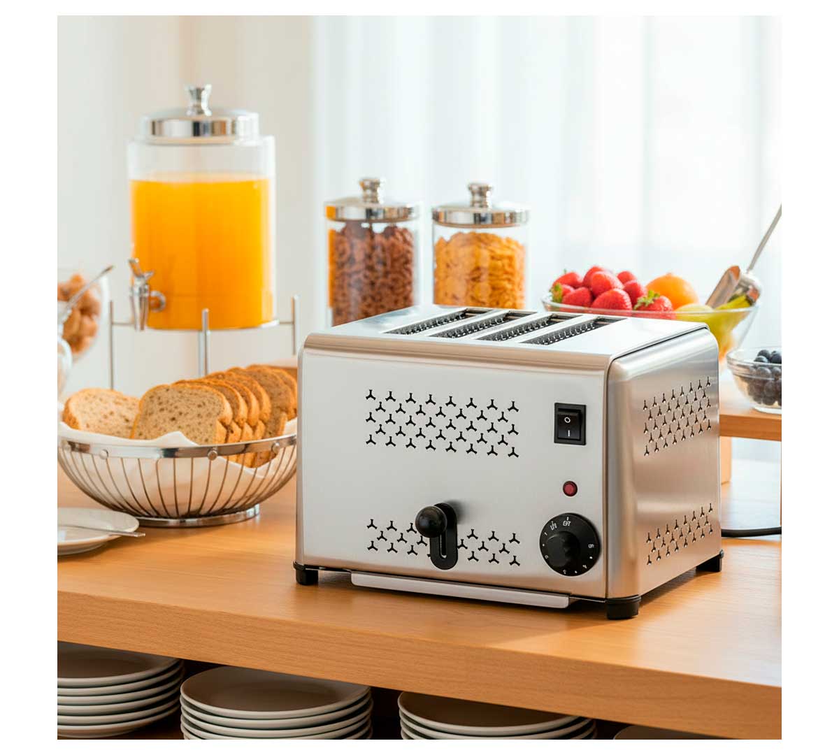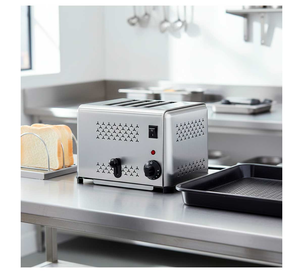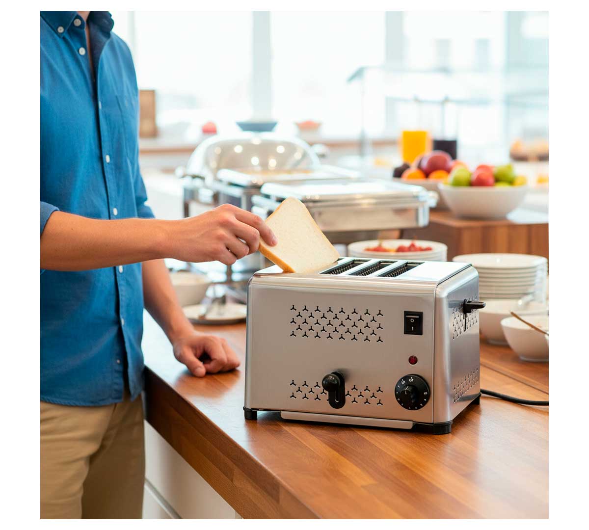 Tostadora con 4 ranuras. Tiene un interruptor para elegir la cantidad de ranuras que se quieren poner en marcha (2 o 4 ). Incluye temporizador. Permite una producción de 180 rebanadas por hora.