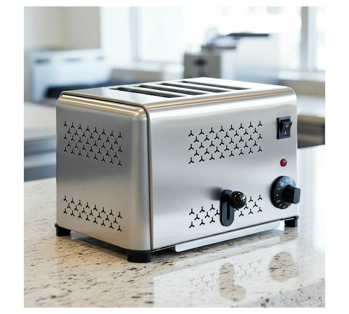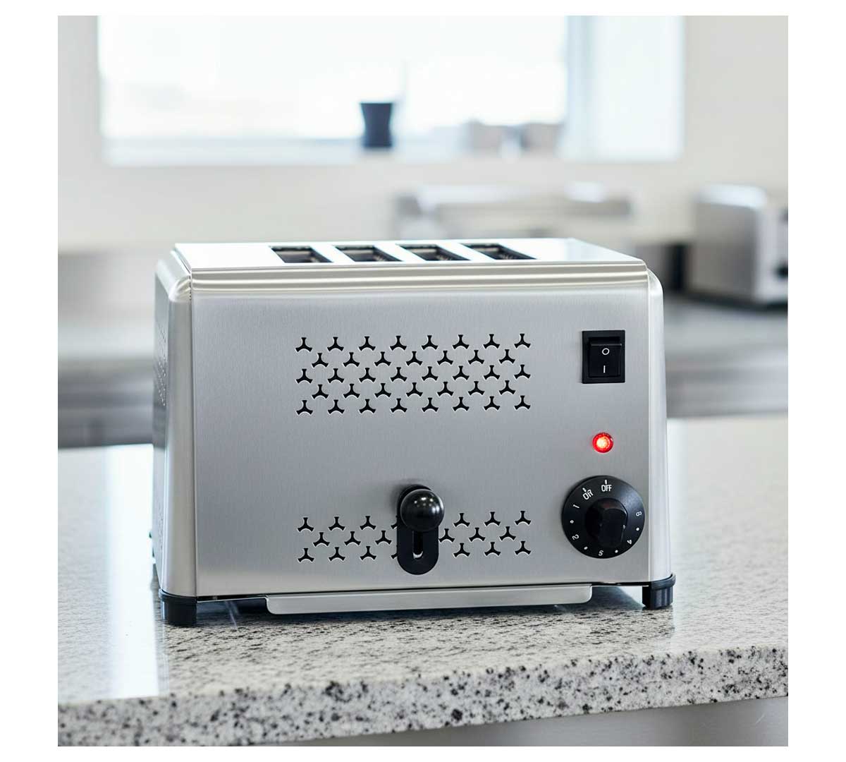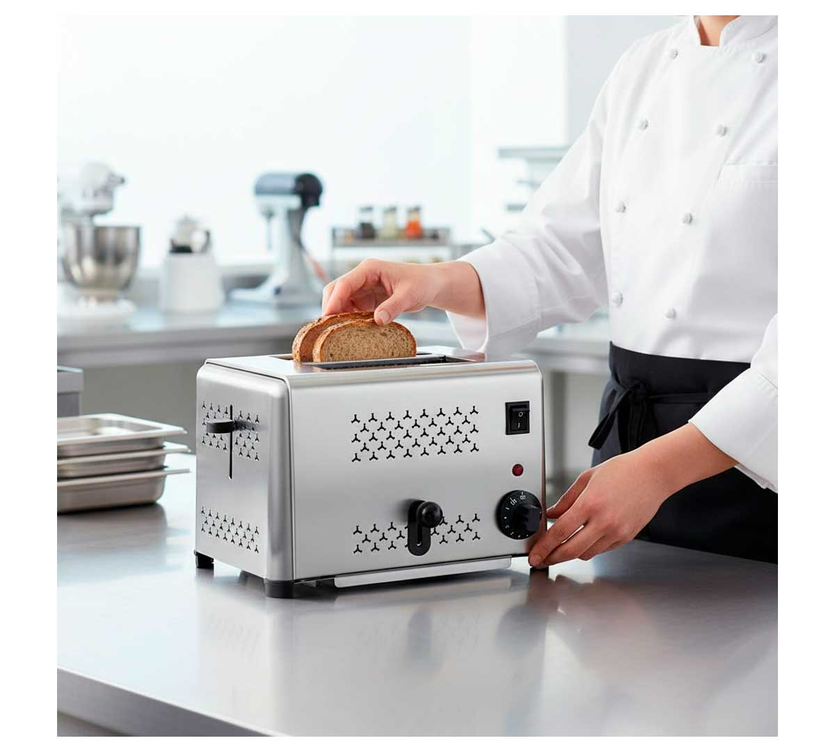 Tostadora con 4 ranuras. Tiene un interruptor para elegir la cantidad de ranuras que se quieren poner en marcha (2 o 4 ). Incluye temporizador. Permite una producción de 180 rebanadas por hora.