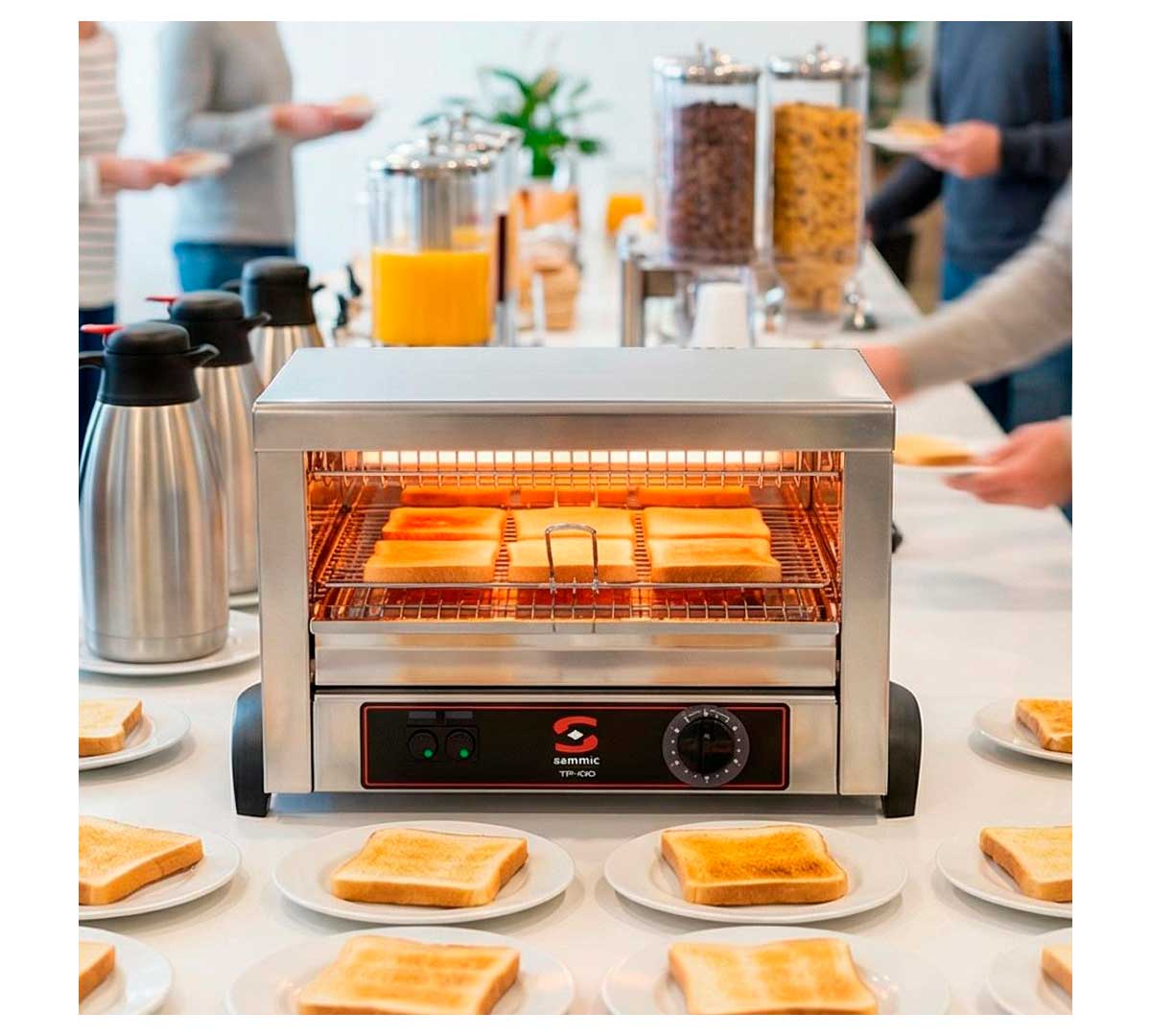 La Tostadora TP-100 de Sammic está diseñada para dar servicio de desayuno en hoteles, comedores, cafeterías, oficinas y buffets. Tiene un nivel de inducción horizontal.