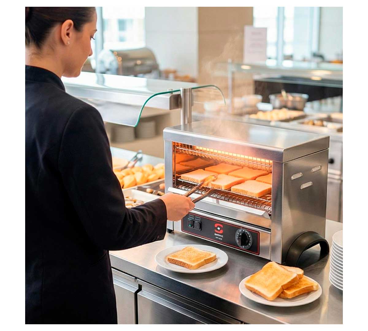 Tostadora de un nivel diseñada para dar servicio de desayuno en hoteles, comedores, cafeterías, oficinas y buffets. Las resistencias son de cuarzo. Incluye temporizador. Permite una producción máxima de 120 tostadas/hora.