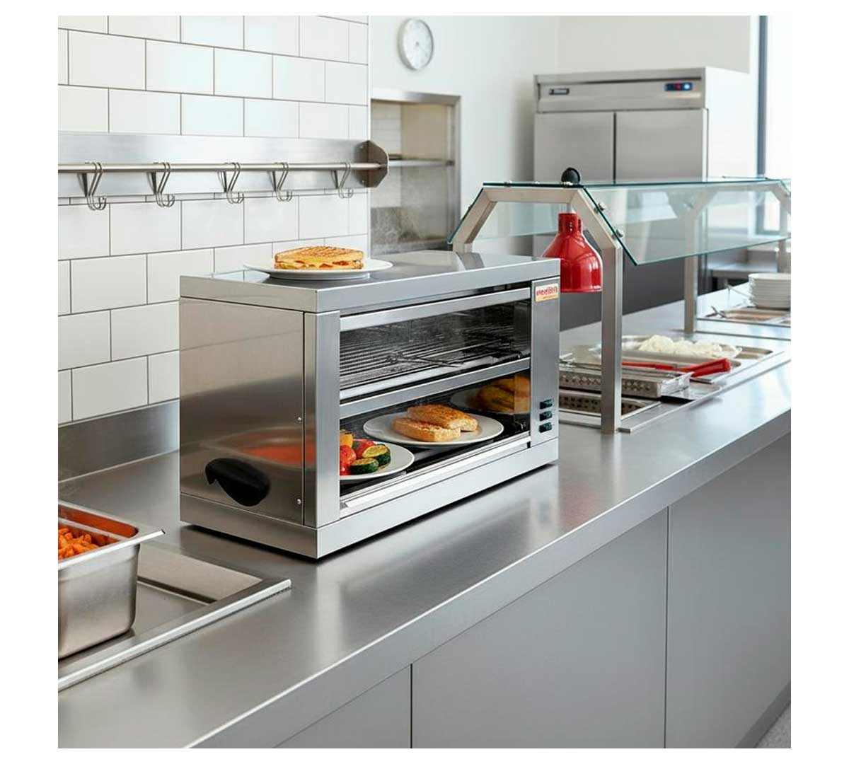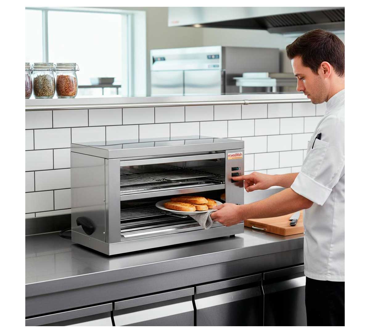 Tostadora eléctrica con dos niveles y sin temporizador. Está fabricada en acero inoxidable y tiene aislamiento térmico. Equipada con parrilla desmontable y cajón recoge migas. Las resistencias son de cuarzo.