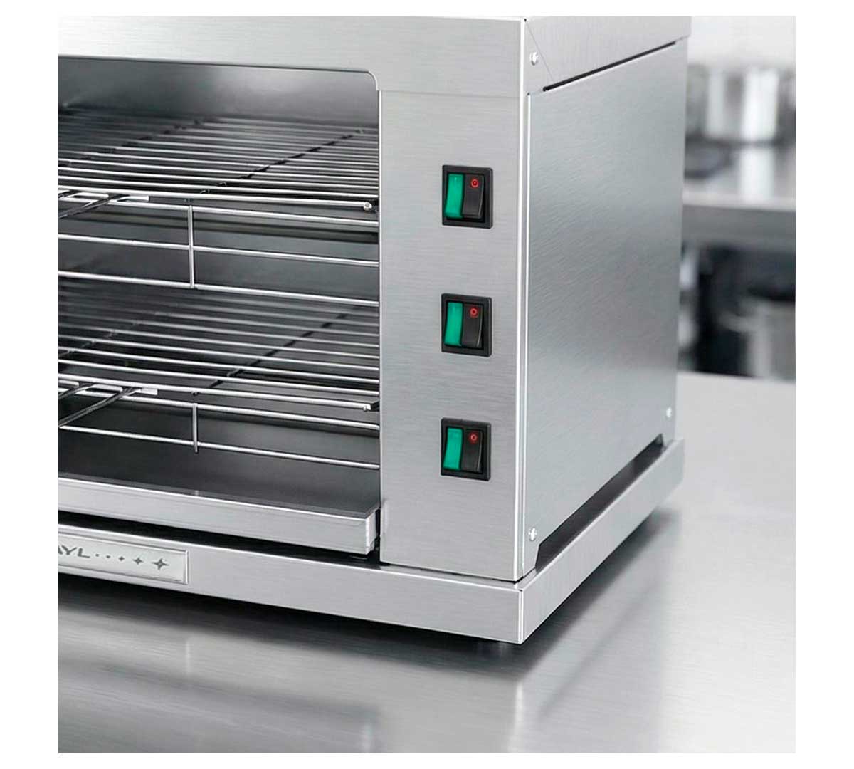 Tostador para hostelería de introducción horizontal. Las resistencias son blindadas e independientes. Incluye bandeja recogemigas. Tiene 2 niveles y está fabricada en acero inoxidable.
