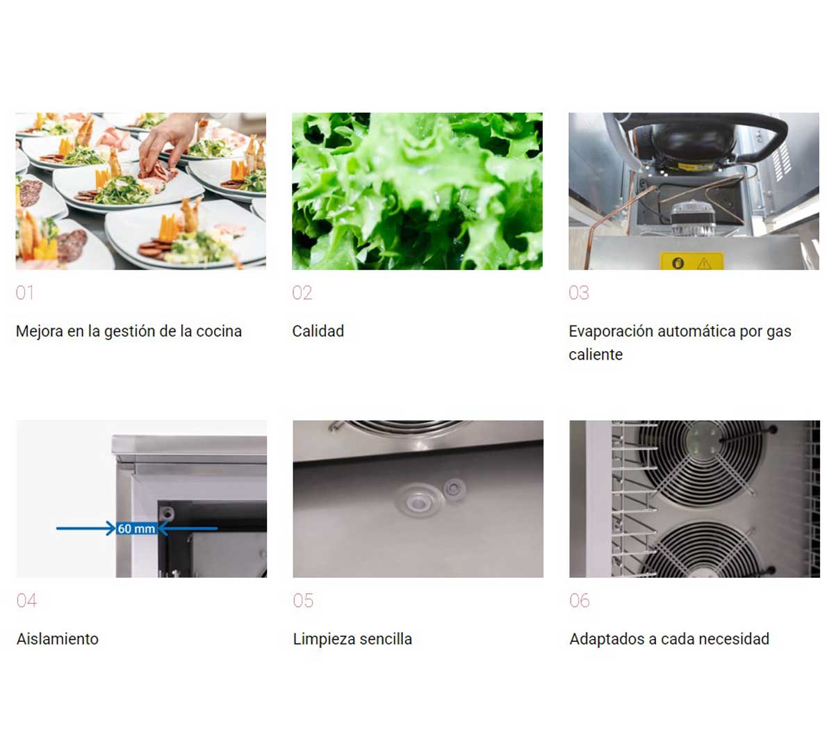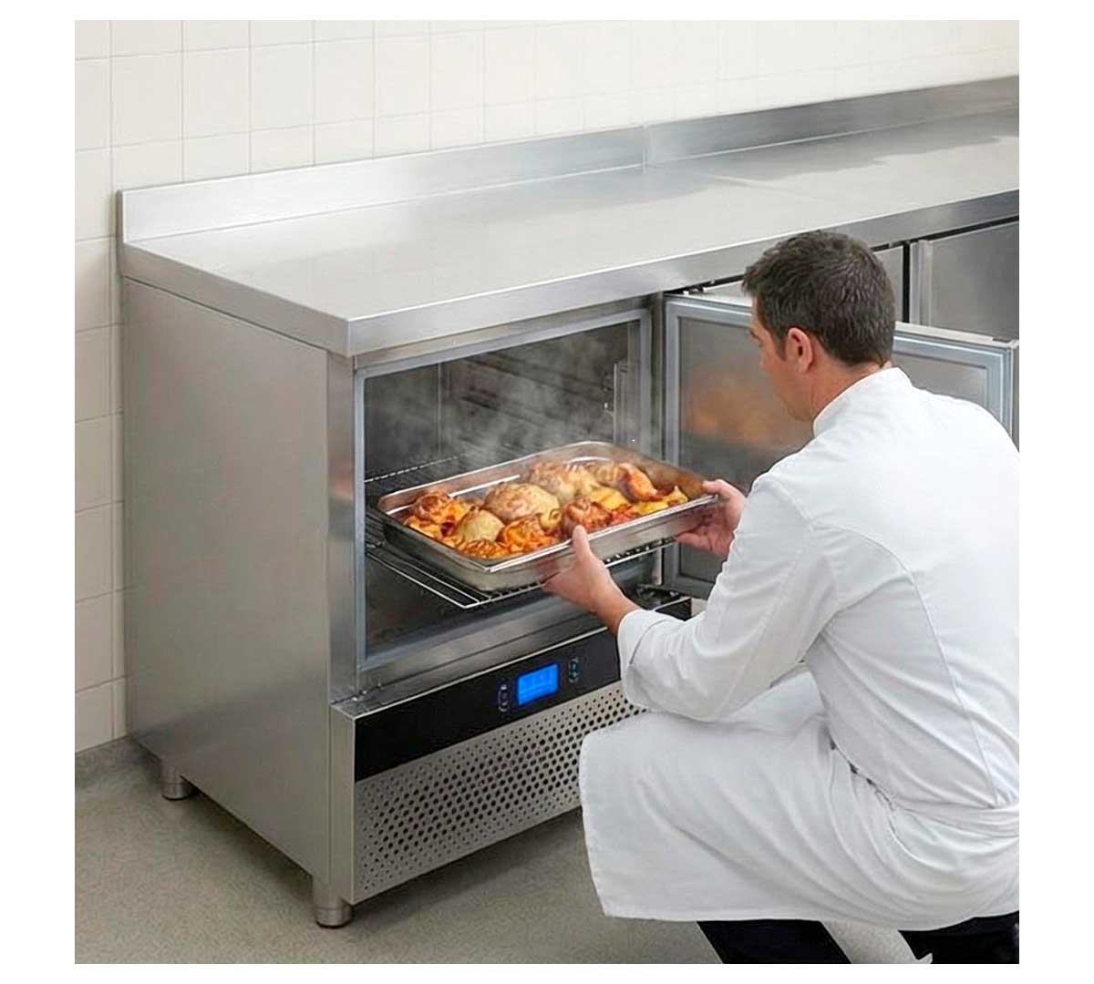 Abatidor de temperatura con panel electrónico con ciclos de enfriamiento y congelación controlables por tiempo o por temperatura. Está disponible en tres tamaños con producción de abatimiento de 40 a 100 kg. Incluye sonda de aguja para controlar la temperatura al corazón.