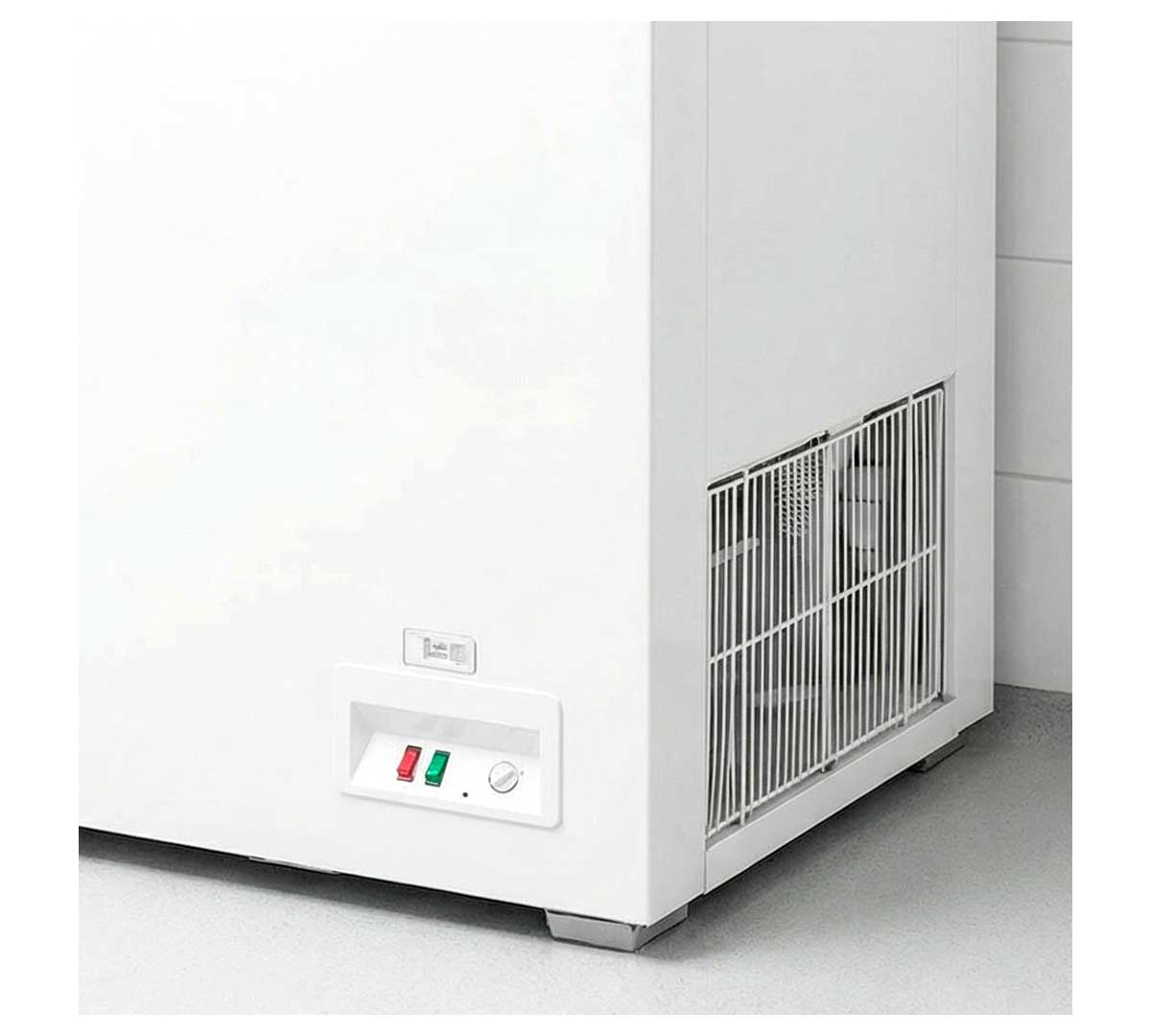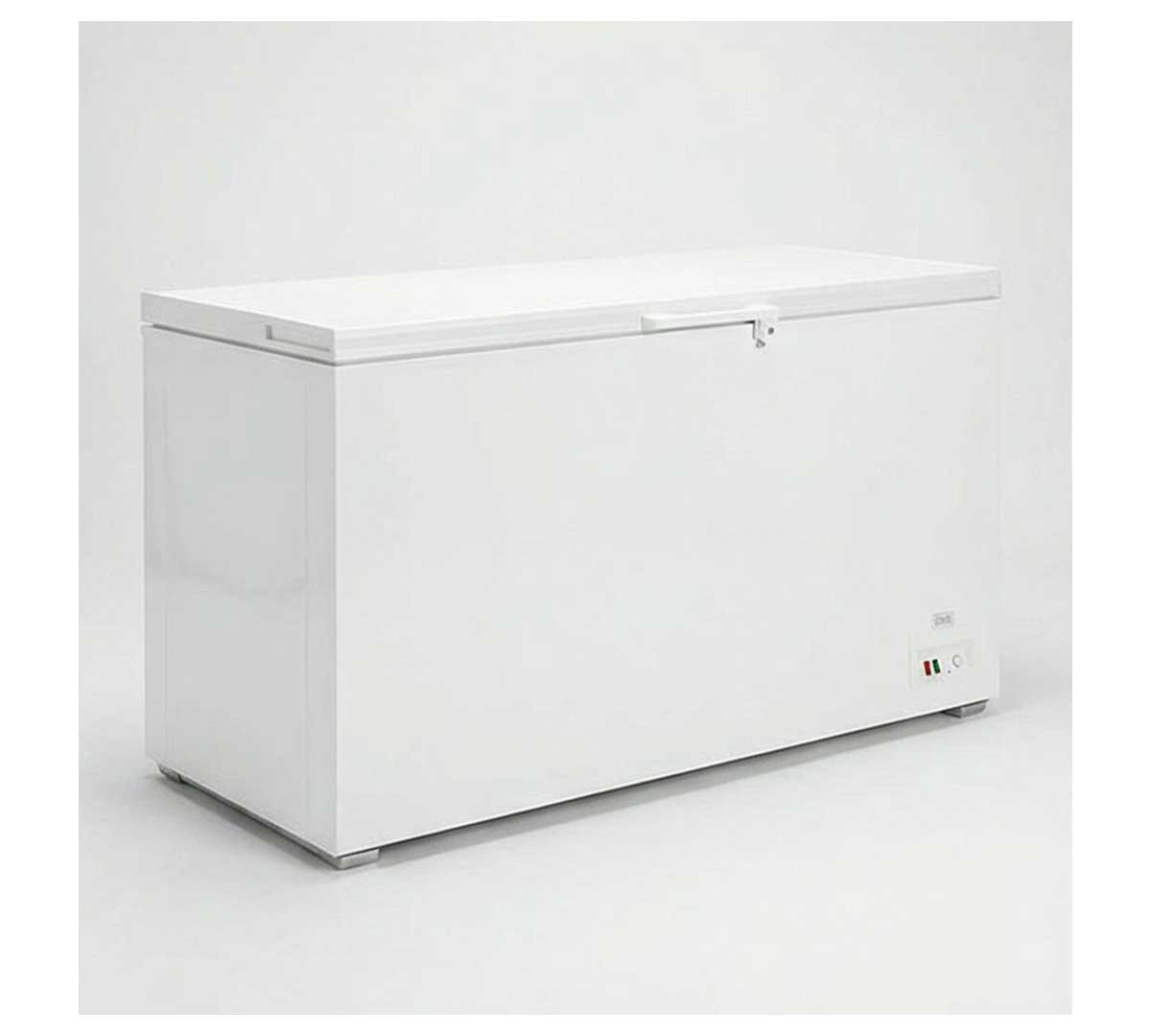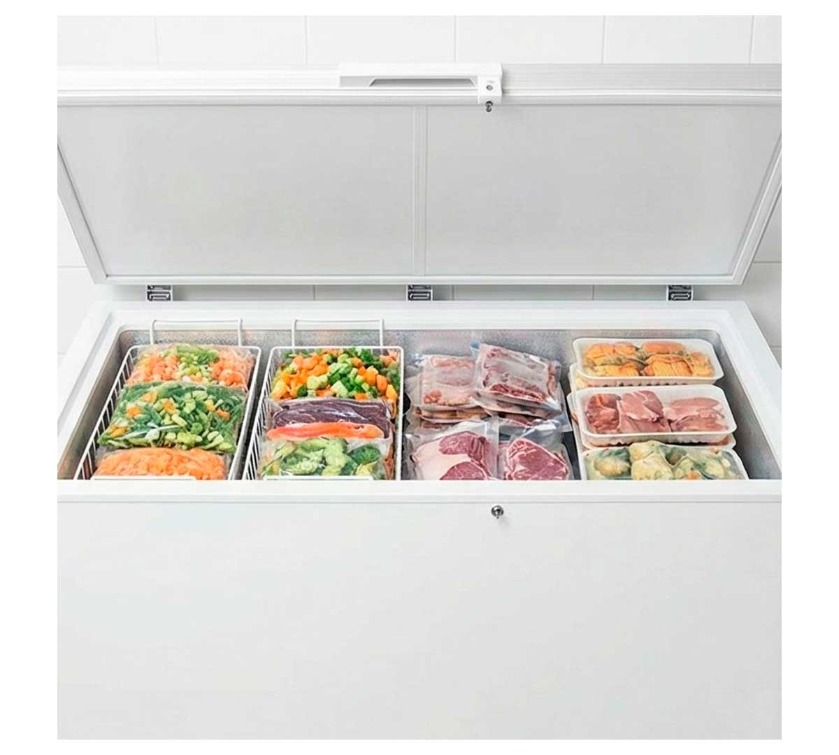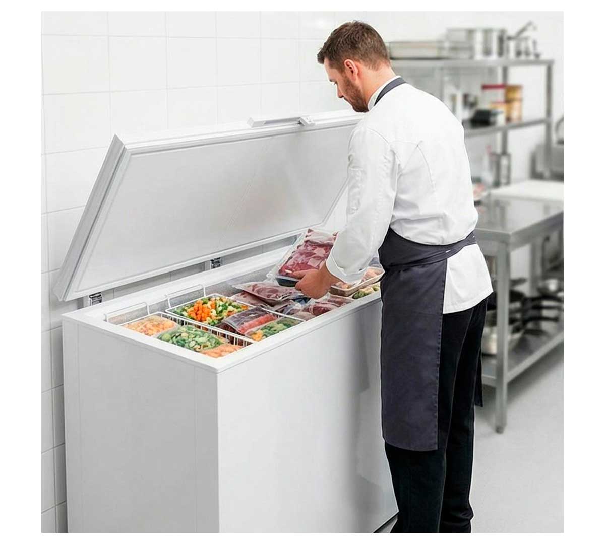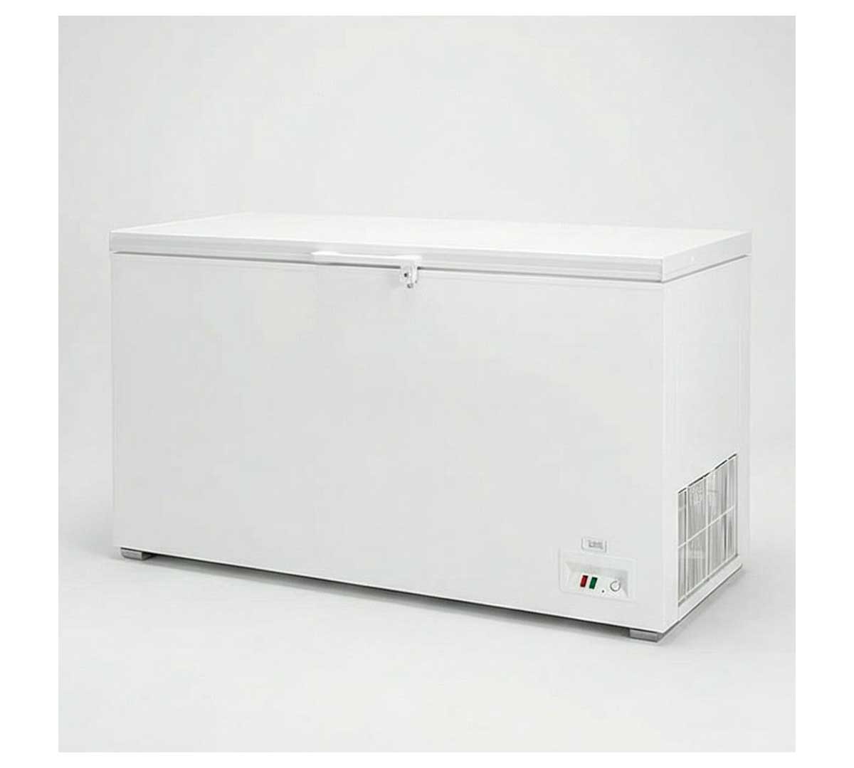 Este congelador horizontal tiene una capacidad de 597 litros. Tiene una puerta ciega abatible con cerradura. El cestillo es opcional.