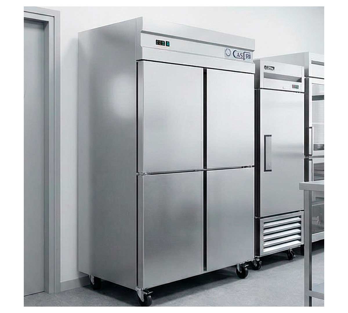 Este modelo de armario refrigerado tiene un diseño especial para Snack. El exterior tiene un acabado en acero inoxidable. De 4 medias puertas opacas. Tiene una capacidad de 900 litros.