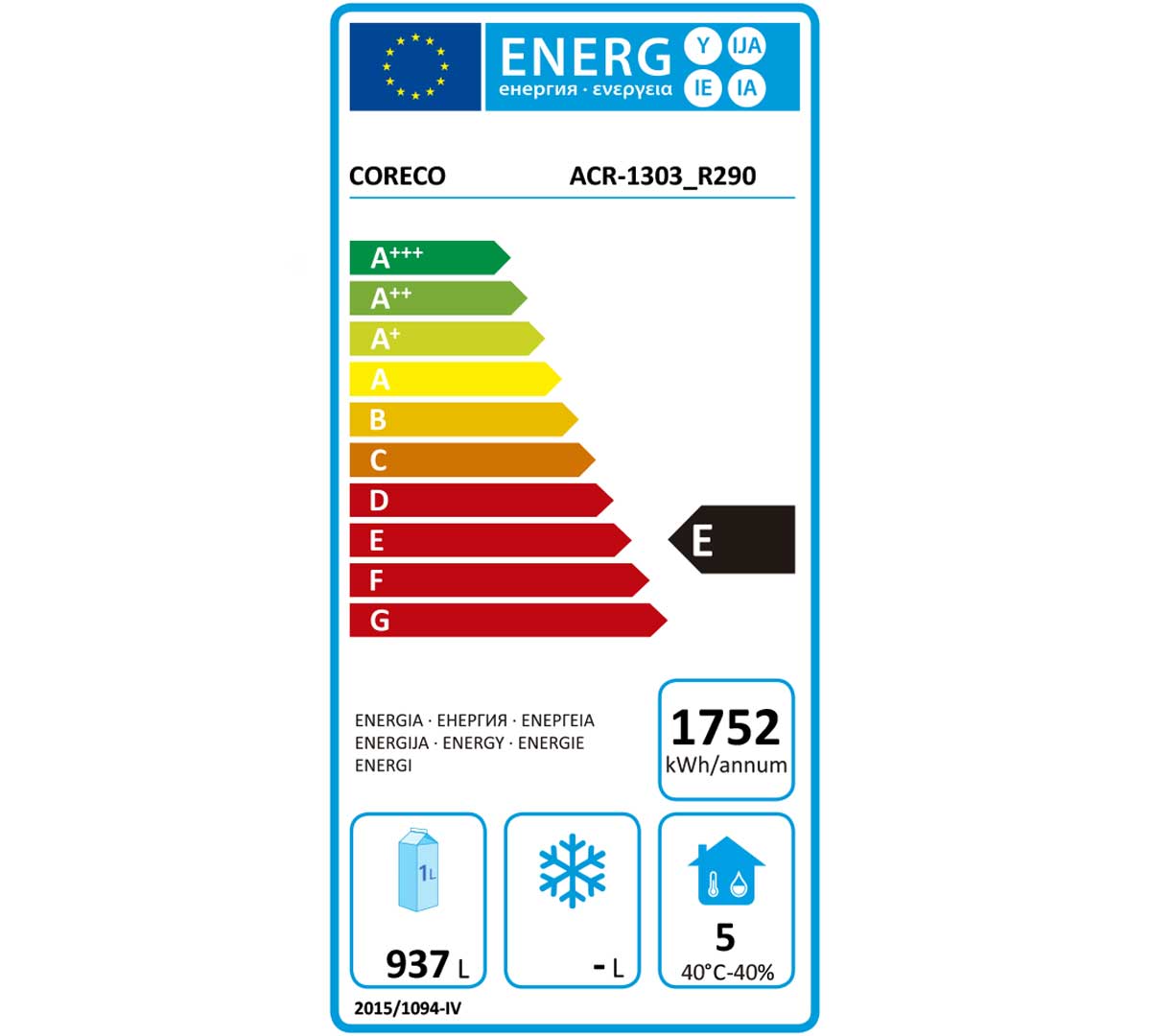 El armario frigorífico ACR-1303 tiene etiqueta de eficiencia energética clase E, según el reglamento 2015/1094.