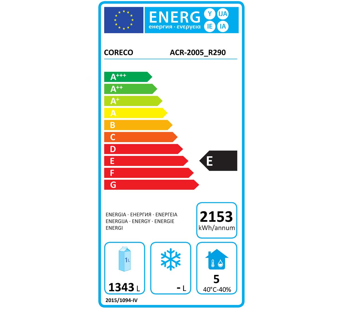 El armario frigorífico ACR-2005 tiene etiqueta de eficiencia energética clase E, según el reglamento 2015/1094.