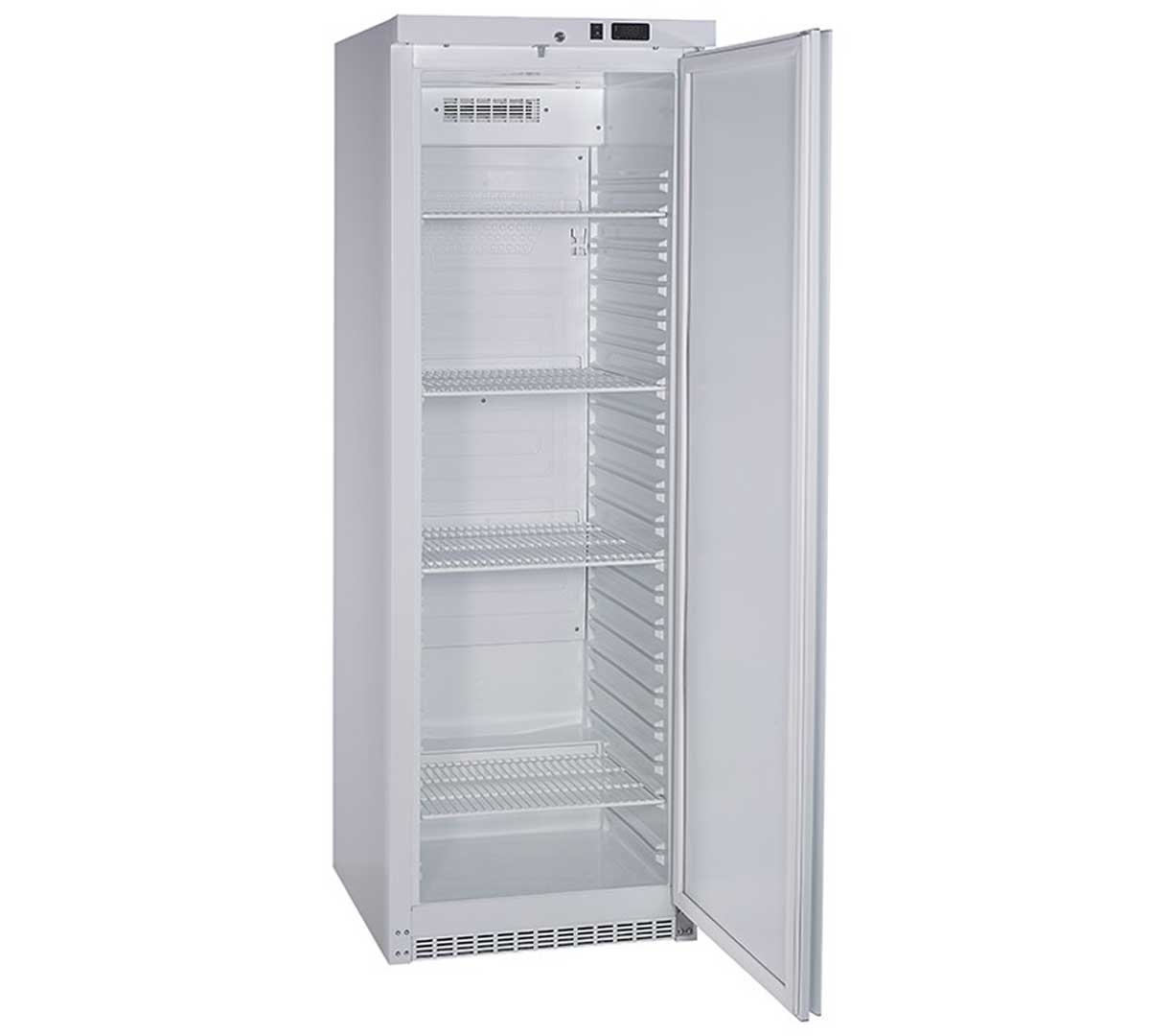 Armario frigorífico con puerta opaca y acabado en epoxi blanco. La refrigeración es estática y el desescarche automático. Incluye 3 parrillas superiores y 1 parrilla para el espacio inferior.