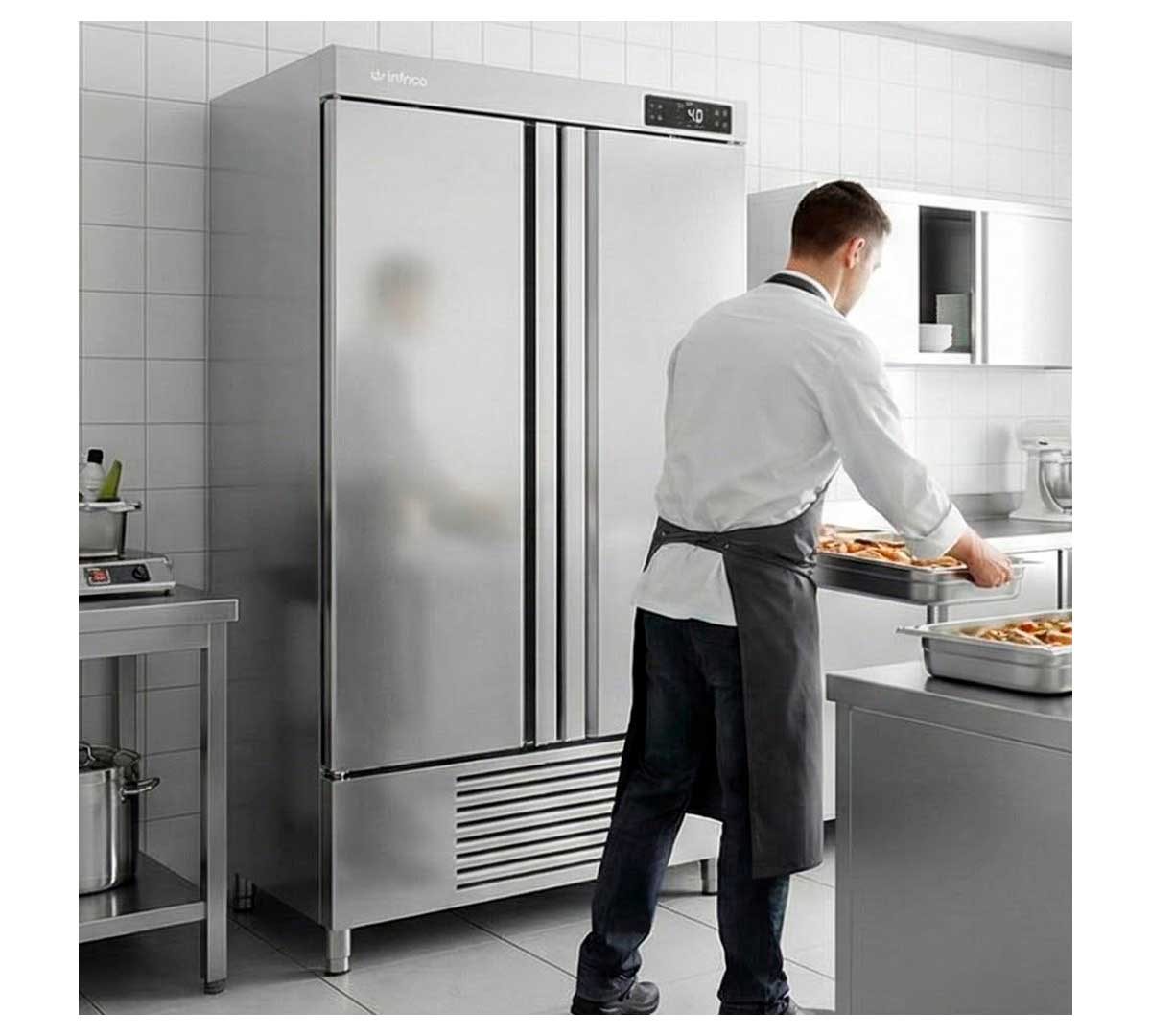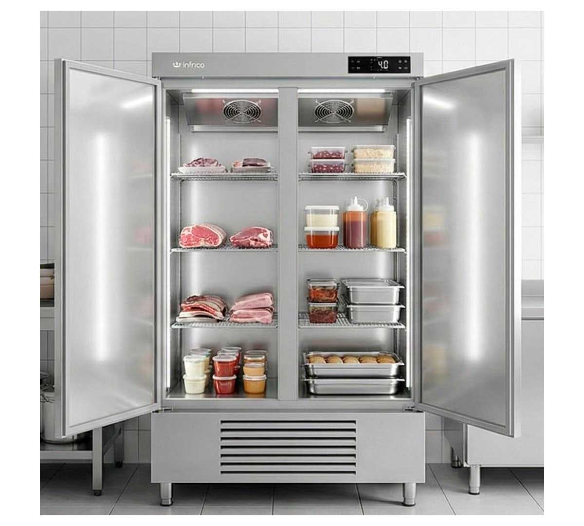 Armario frigorífico con 2 puertas opacas. Tiene controlador digital táctil, iluminación LED y el sistema de frío es ventilado. Permite un rango de temperatura de -2º a 8 ºC. Incluye 6 parrillas 60 x 40 cm y 6 juegos de guías. Con tecnología inverter que reduce el consumo de energía hasta un 40% en comparación con un compresor fijo (on-off).
