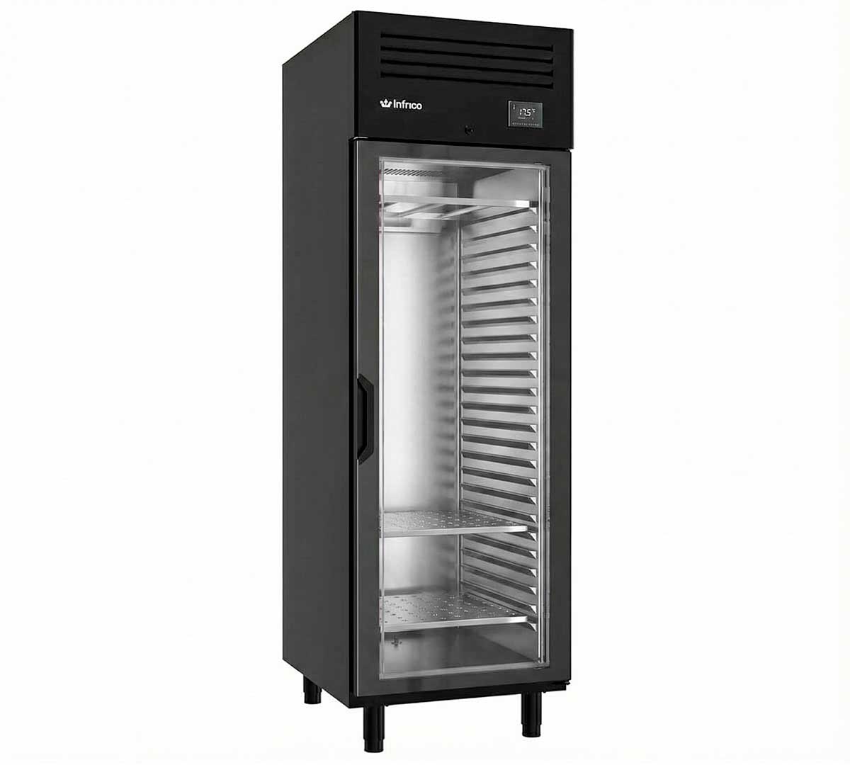 Este modelo de armario madurador de carne Dry Aging pertenece a la serie AGB. Tiene un acabado en acero galvanizado lacado en Negro. Equipado con puerta de cristal, 1 barra carnicera y 2 bandejas inox perforadas.