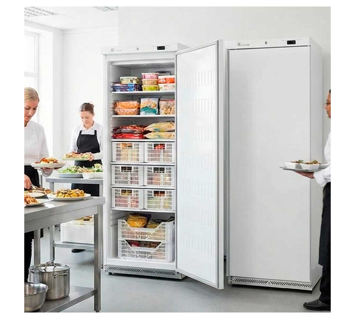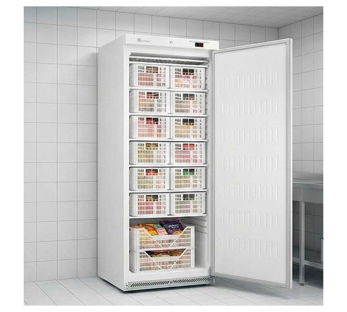 Armario congelador gastronorm con puerta opaca. La temperatura de funcionamiento es -18 a -21 ºC. El termostato es digital. Incluye 6 estantes fijos y 14 cajones. Tiene una capacidad de 520 litros. Está disponible en dos modelos, en chapa de acero inoxidable o plastificada en color blanco.