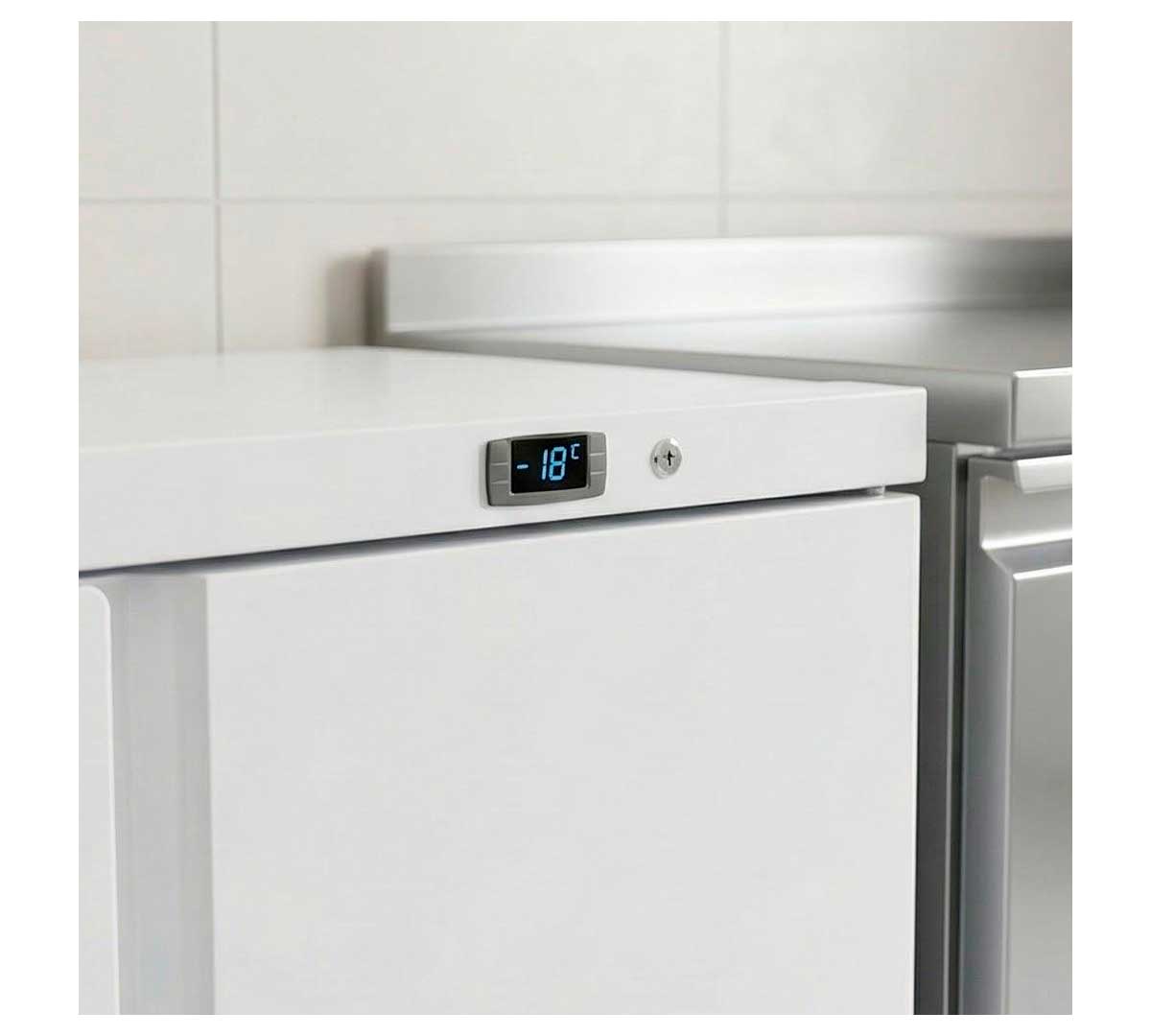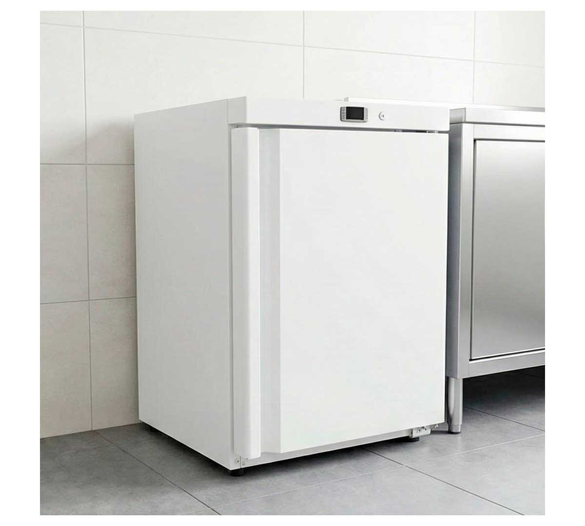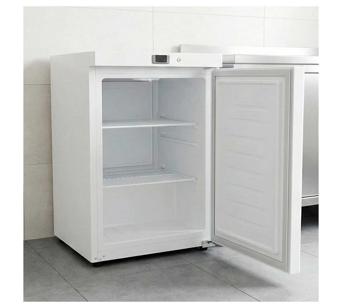 Armario congelador versión mini con frío estático en color blanco. Control electrónico digital de la temperatura y del desescarche. El rango de temperatura es de -22 a -10 ºC. Tiene una capacidad de 113 litros. Incluye 2 estantes fijos.