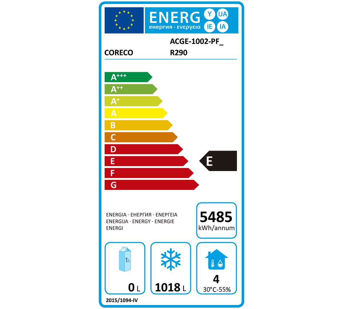 El congelador vertical ACGE 1002 tiene etiqueta de eficiencia energética clase E, según el reglamento UE 2015/1094.