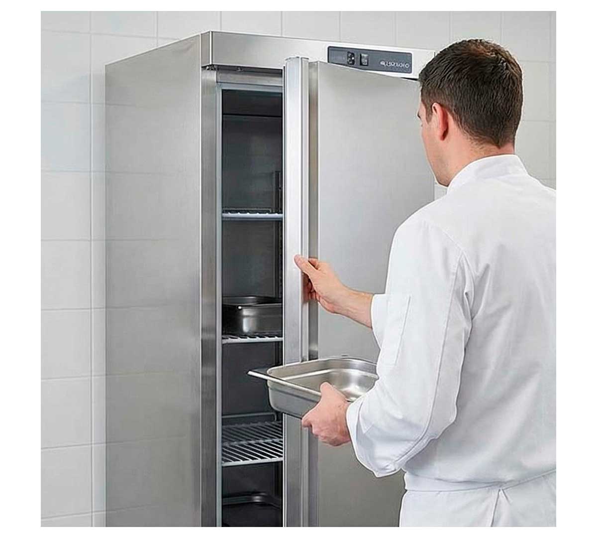 Armario congelador fabricado en acero inoxidable. Dispone de un aislamiento en poliuretano inyectado a alta presión. Temperatura -15/-22ºC. Puerta opaca.