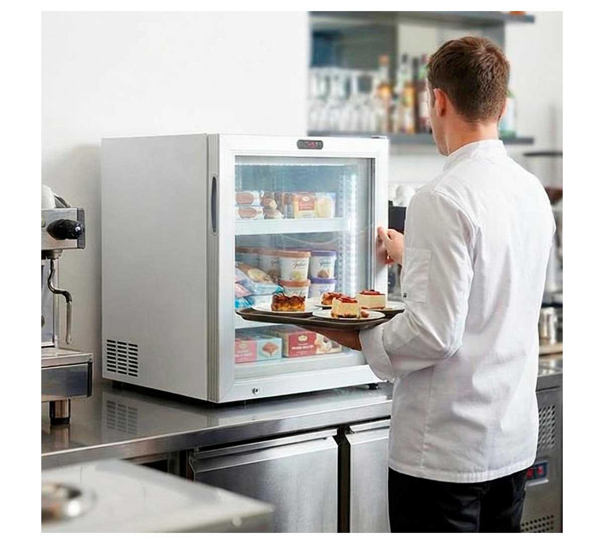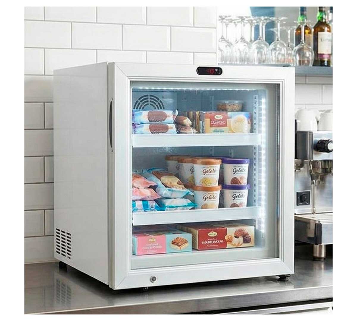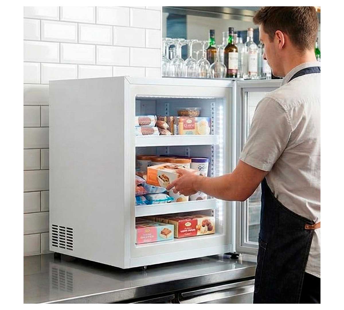 Congelador compacto de 55 litros de capacidad. Tiene un rango de temperatura de hasta -25 ºC. Es ideal para conservar productos congelados en espacios reducidos de Hostelería. Incluye 2 estantes.