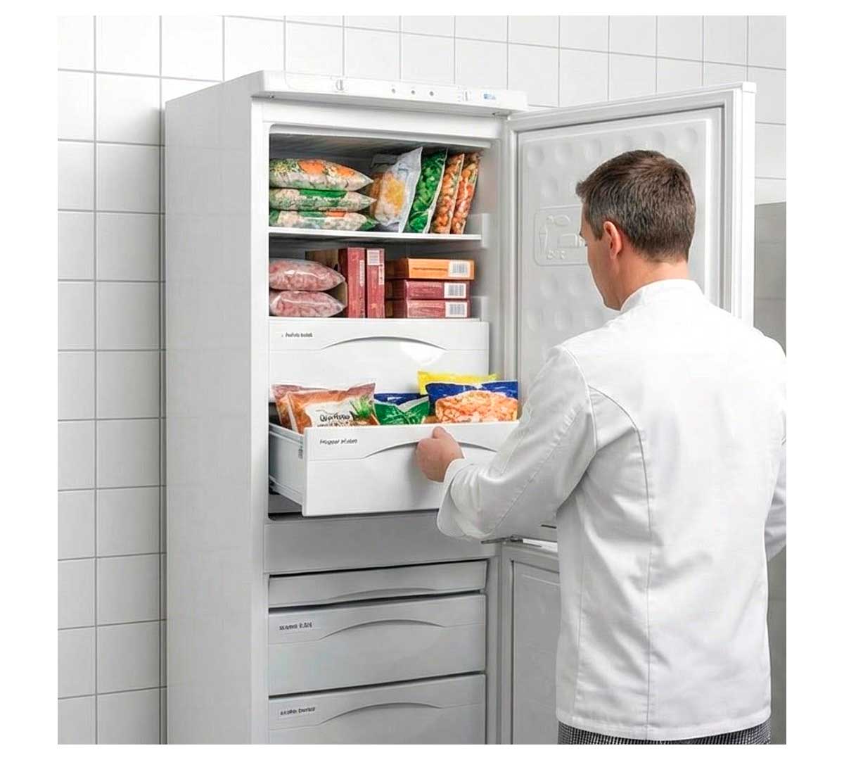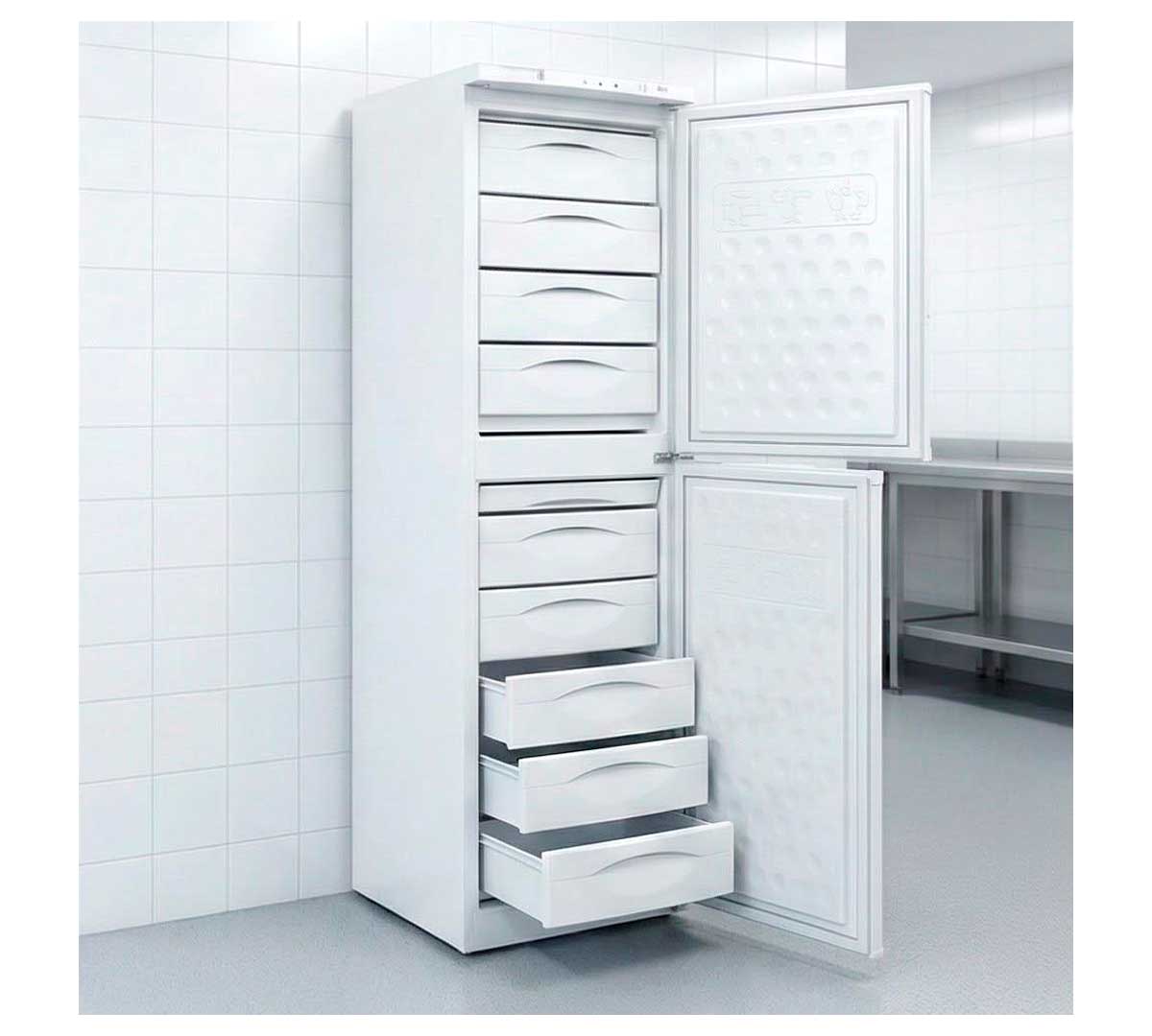 Armario congelador puerta opaca con 2 puertas abatibles. Está fabricado con exterior en chapa plastificada e interior en termoconformado. Equipado con termostato, piloto red, alarma e interruptor de congelación rápida. Tiene un rango de temperatura de -18 a -23 ºC con sistema de refrigeración estática. Incluye 9 cajones (2 abatibles). Para uso poco intensivo.