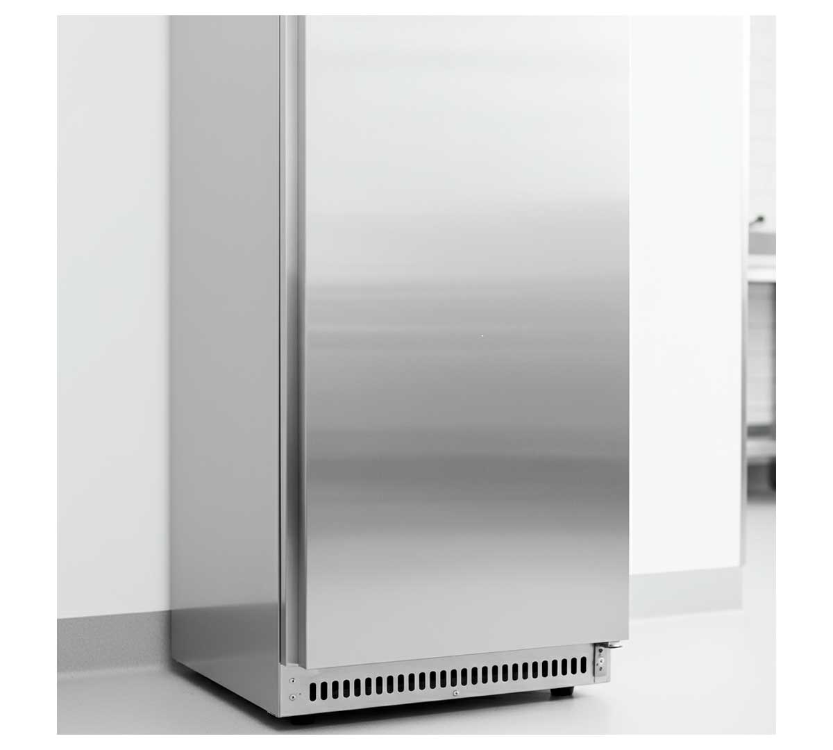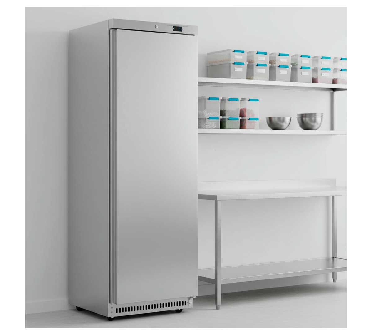 Armario congelador con puerta opaca. Está disponible con acabado en acero inoxidable o en color blanco. Está equipado con termostato digital. Permite un rango de temperatura de -18ºC a -22ºC. Incluye 6 estantes fijos, cerradura y ruedas.