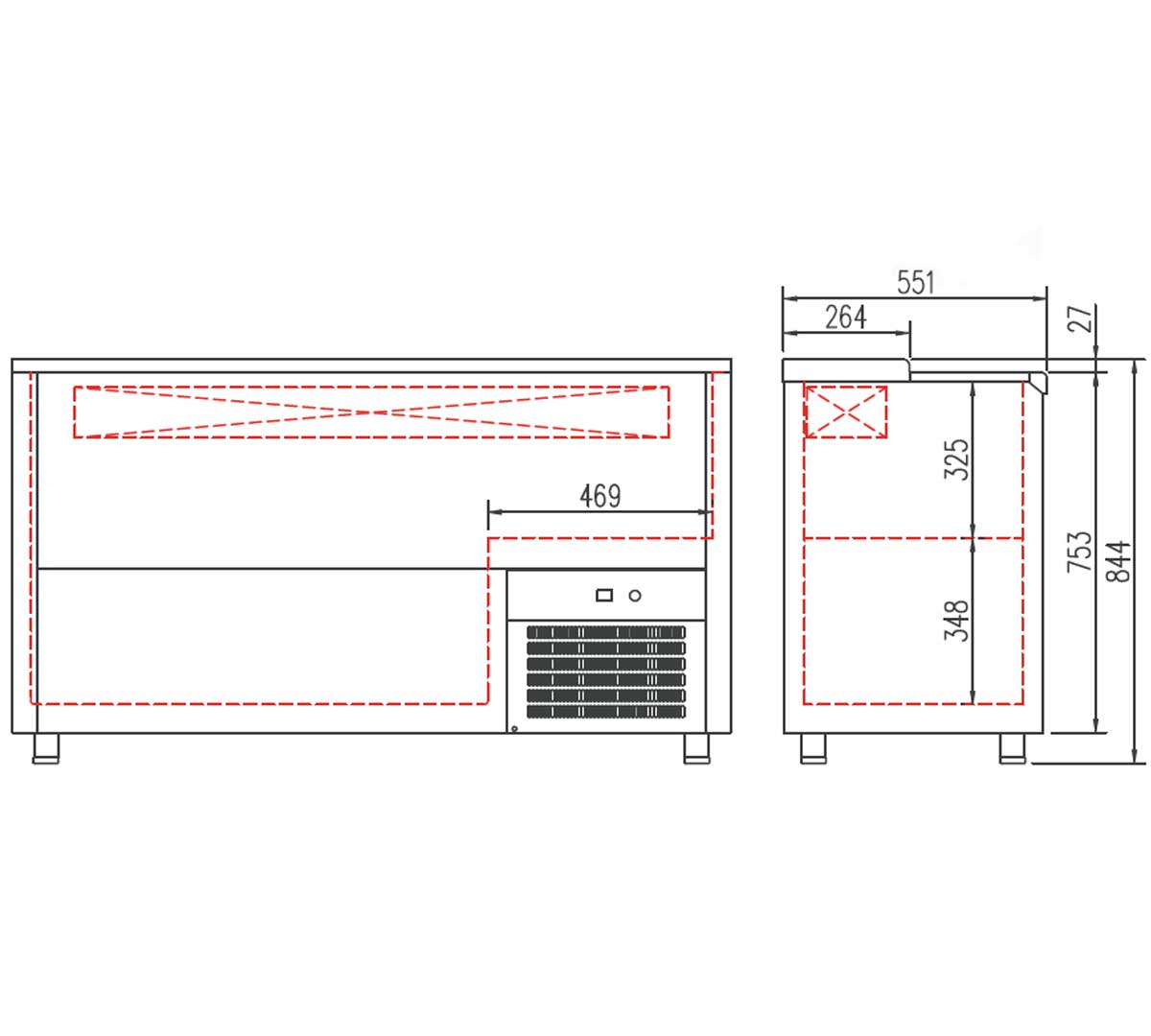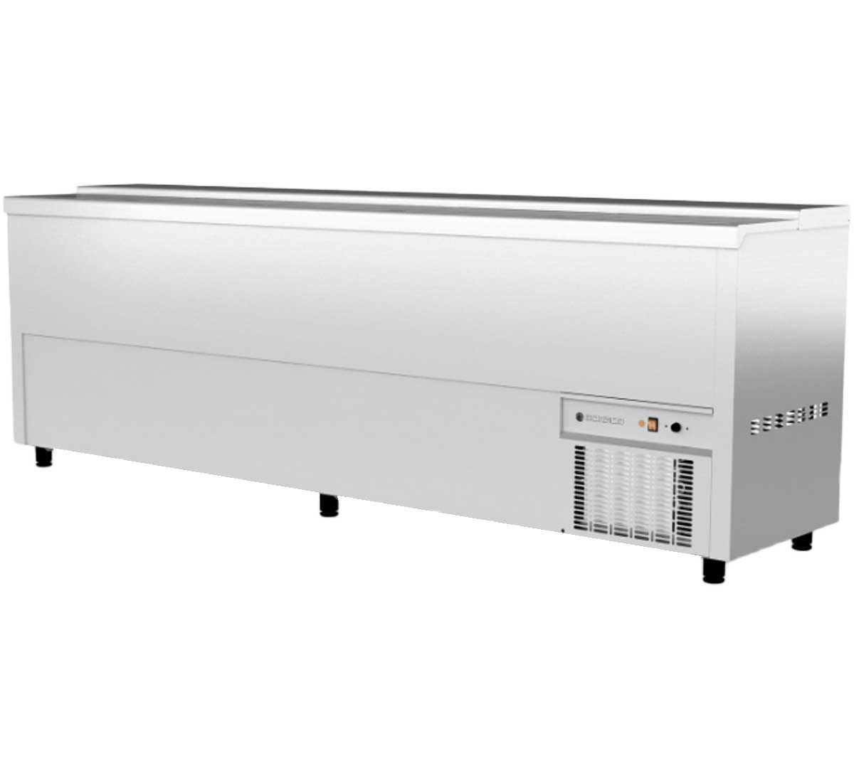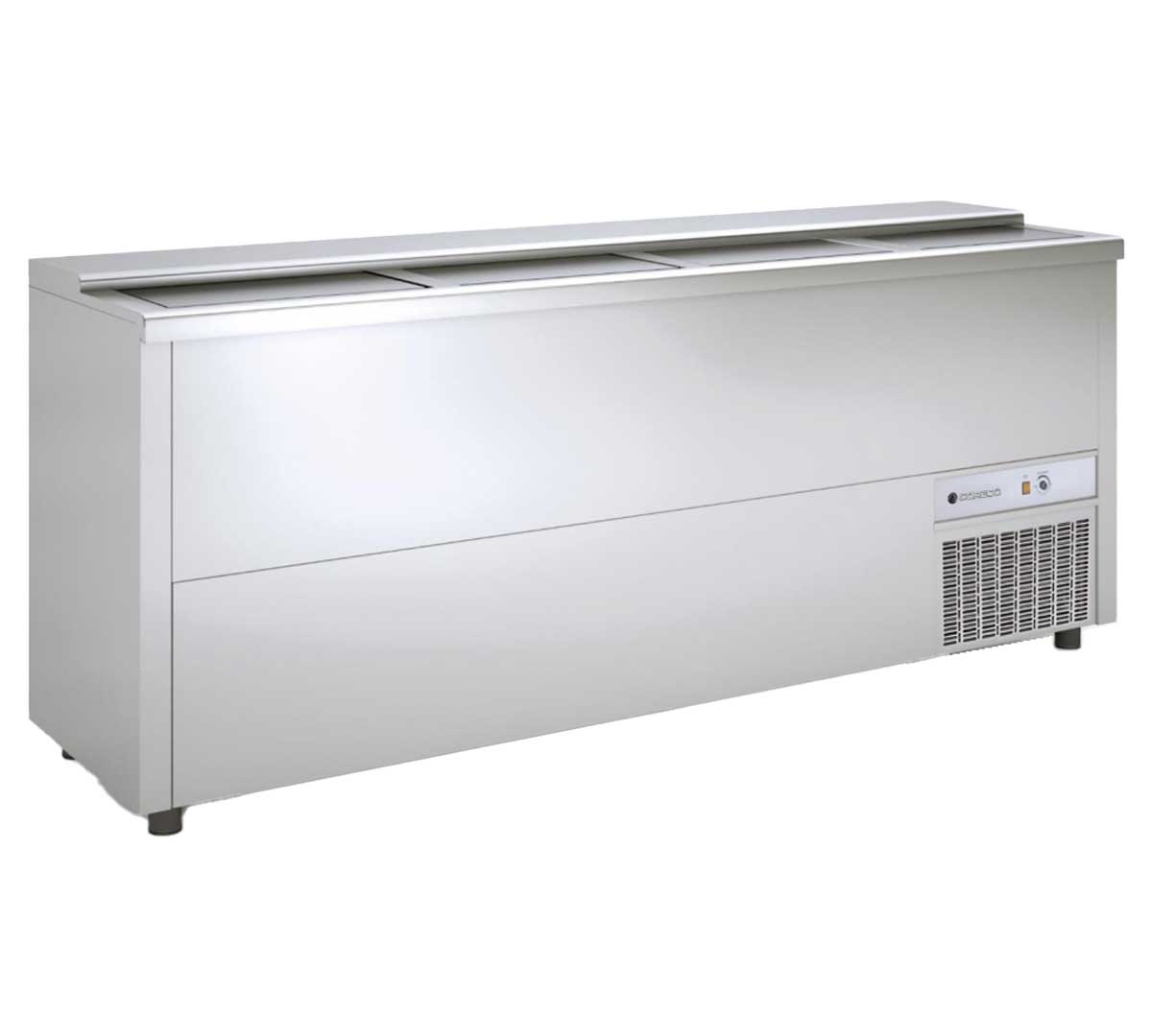 Enfriador de botellas con exterior en acero inoxidable e interior en aluminio. Tiene puertas deslizantes y el aislamiento de poliuretano. Incluye separadores interiores. Rango de temperatura de 2 a 8 °C y está equipado con condensador ventilado extraíble.