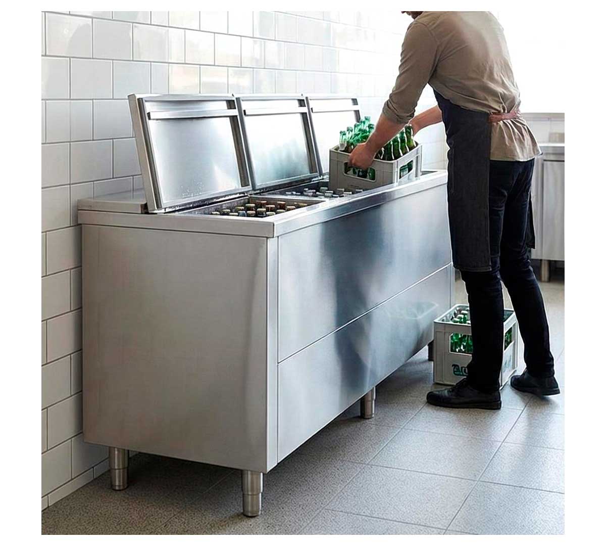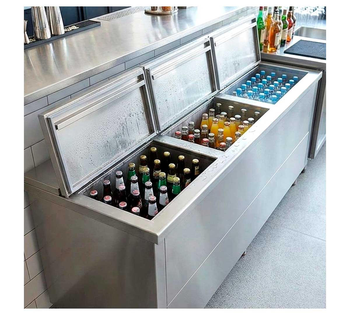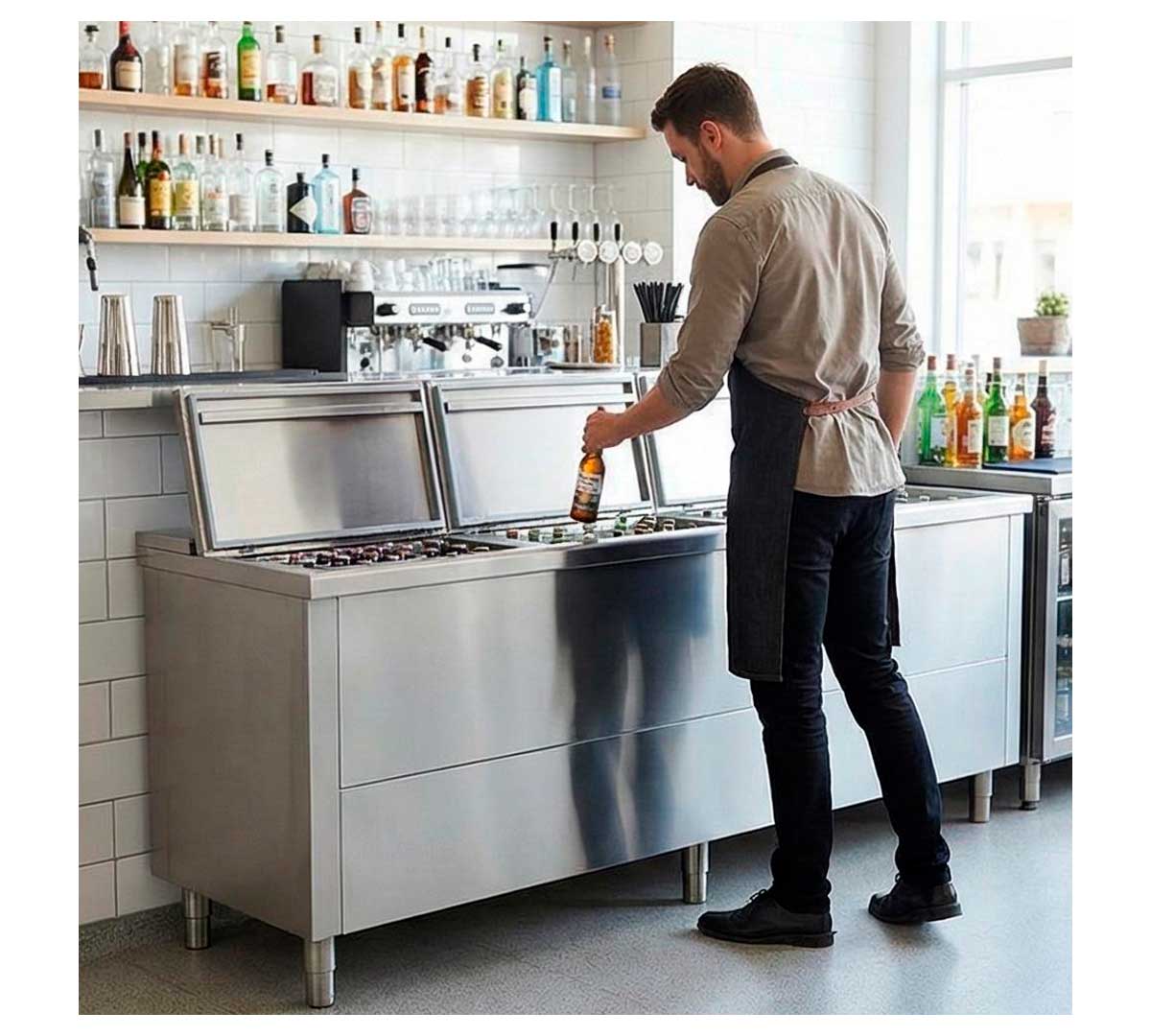 Botellero eléctrico con interior y exterior en acero inoxidable. El grupo motor va colocado a distancia, de gran ventaja si se desea reducir el ruido o conectarse a una unidad central de varios equipos. La temperatura de trabajo es de 0 a +8 ºC.