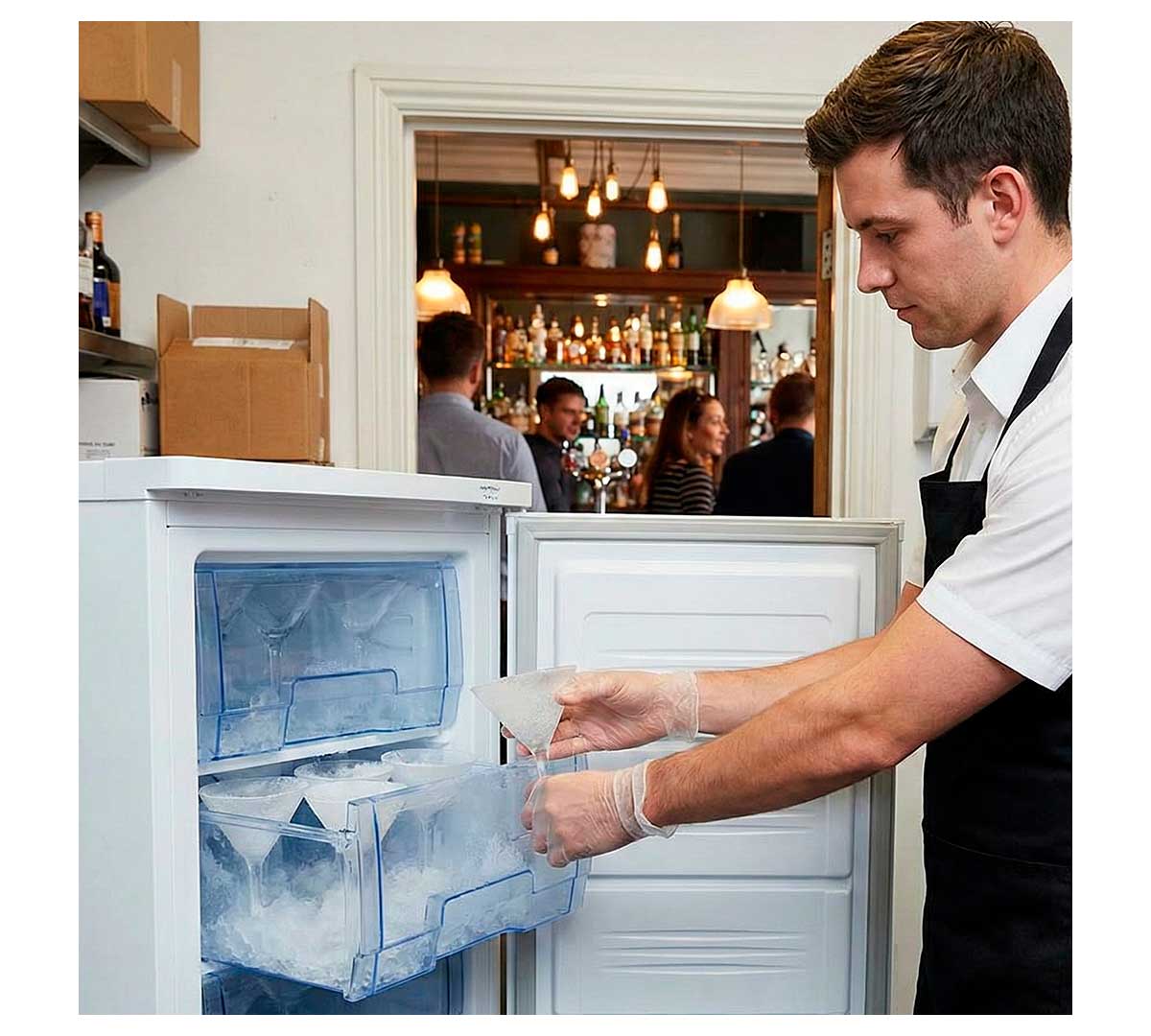 Escarchador de copas y congelador de uso profesional. Fabricado con puerta y cuba interior en chapa plastificada color blanco. Provisto de sistema de refrigeración estática con evaporador en los estantes. El termostato es ajustable. Incluye 7 cajones y 6 estantes.