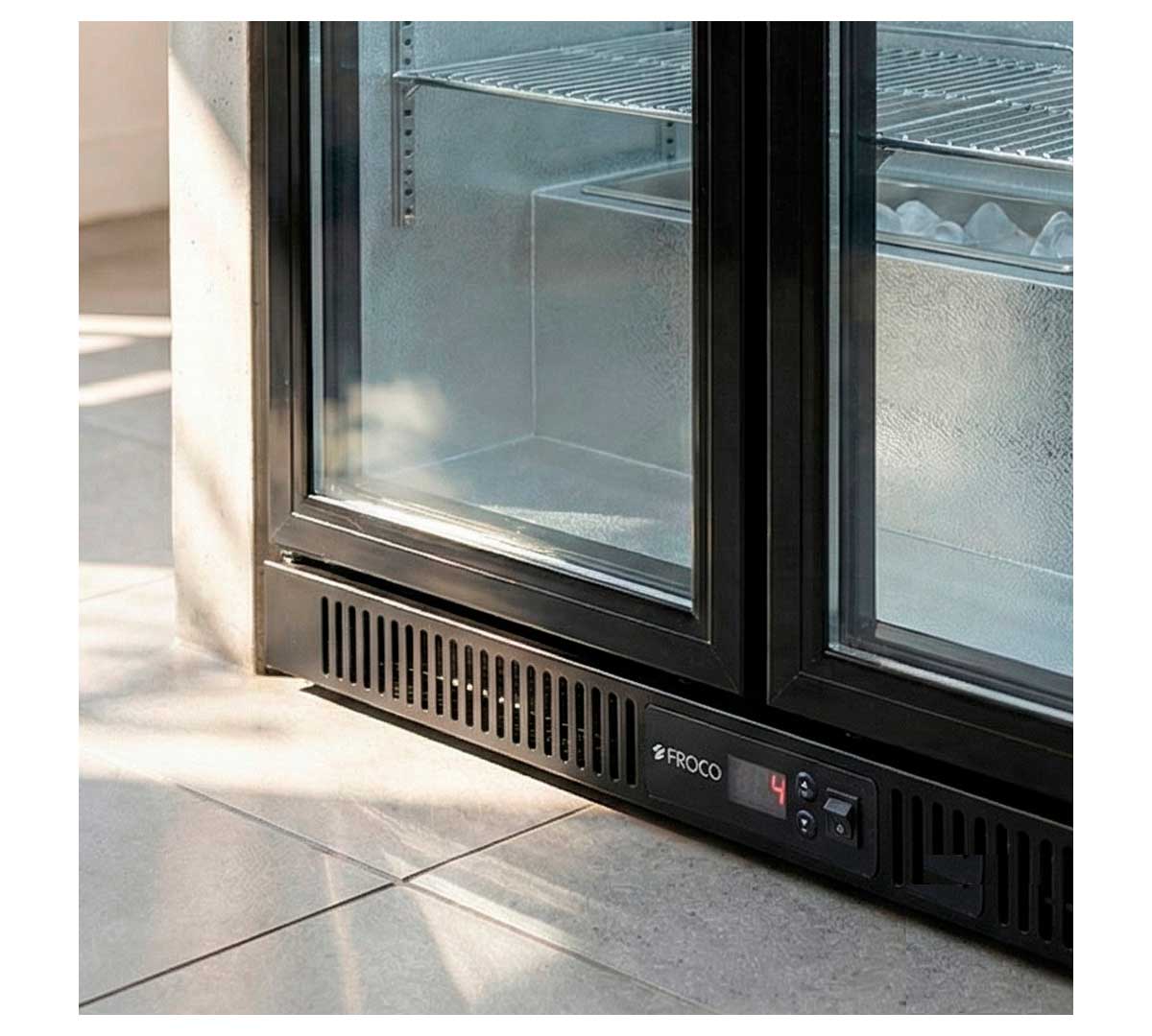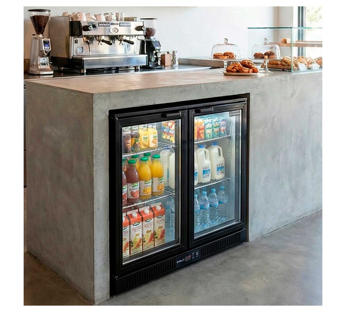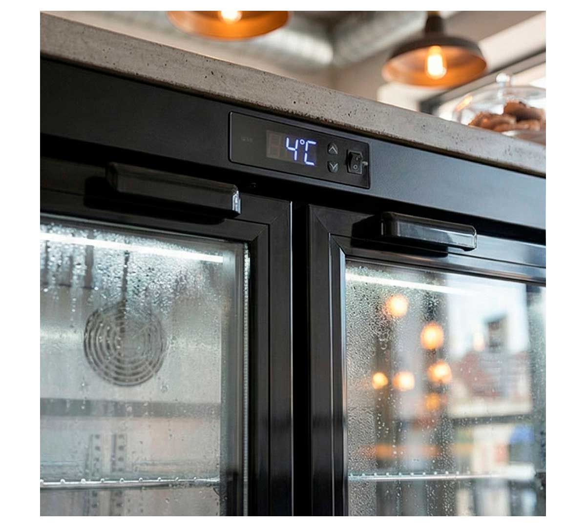 Armario expositor frigorífico de contrabarra con 2 puertas correderas. Tiene una capacidad de 208 litros, con un rango de temperatura de +2 a +8 ºC. Es ideal para bares, permite mantener las bebidas frías de mayor venta. Fabricado en chapa de acero color negro. Está dotado de 2 estantes cromados.