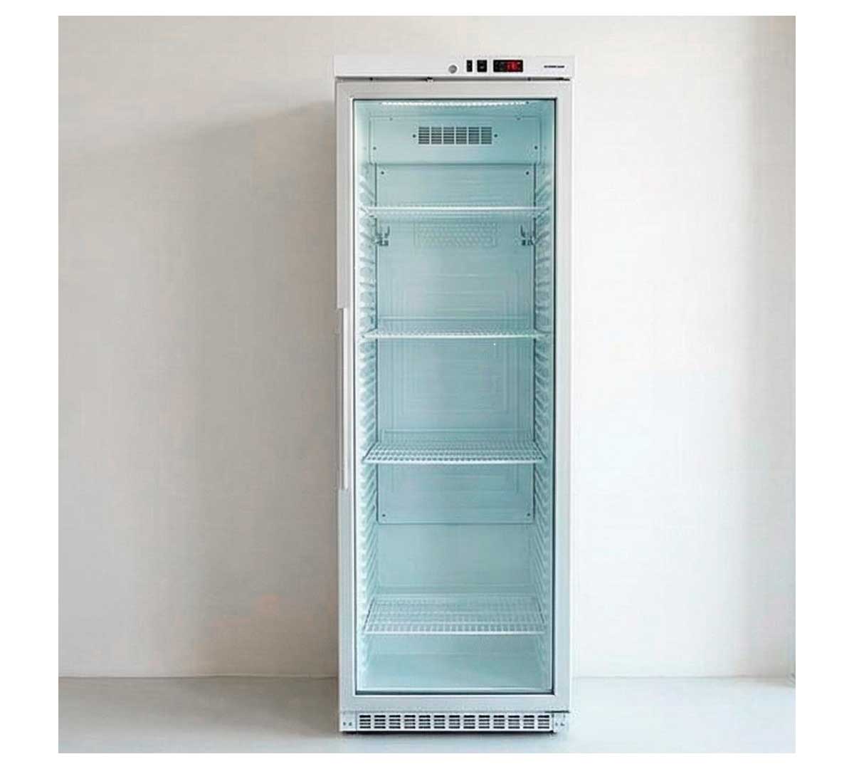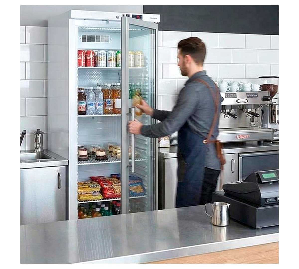 El Armario Frigorífico Basic MAR460 PV BL tiene el acabado exterior en epoxi blanco y la puerta es de cristal. Equipado con cerradura con llave y termómetro digital.