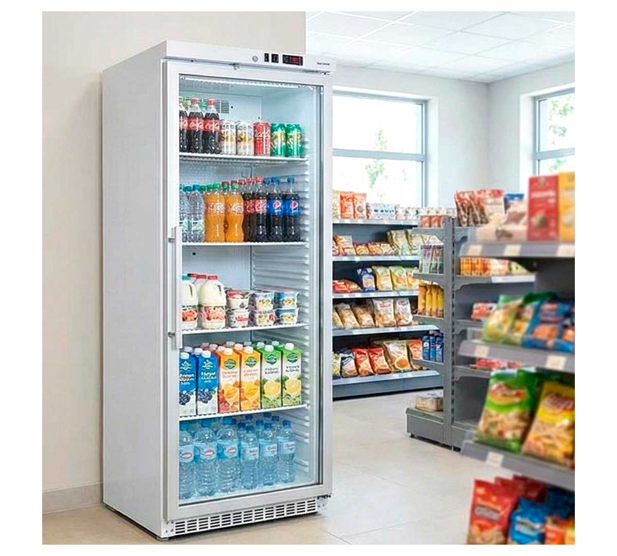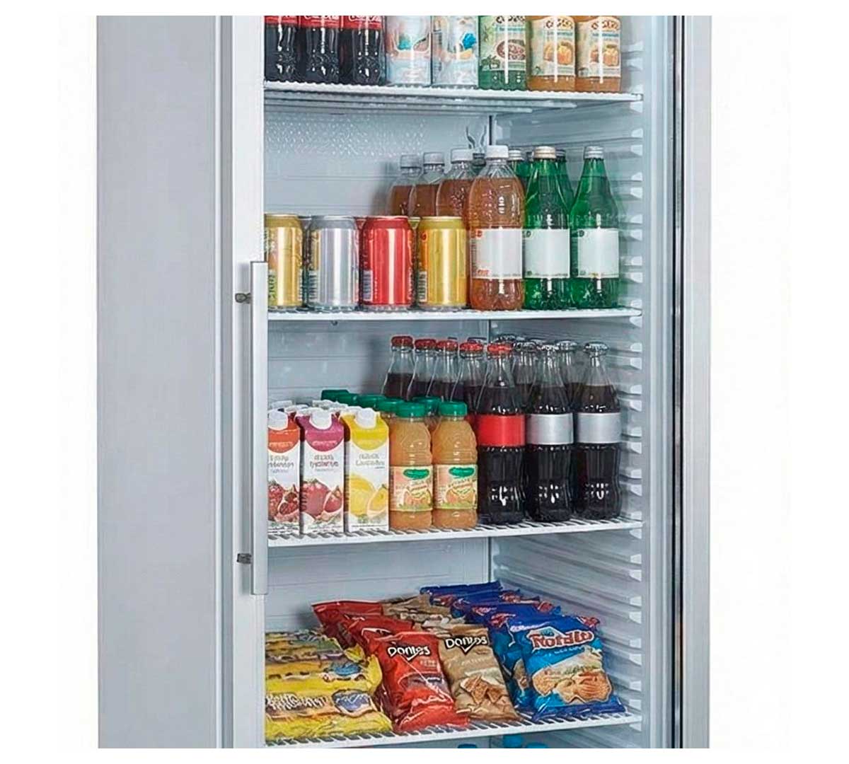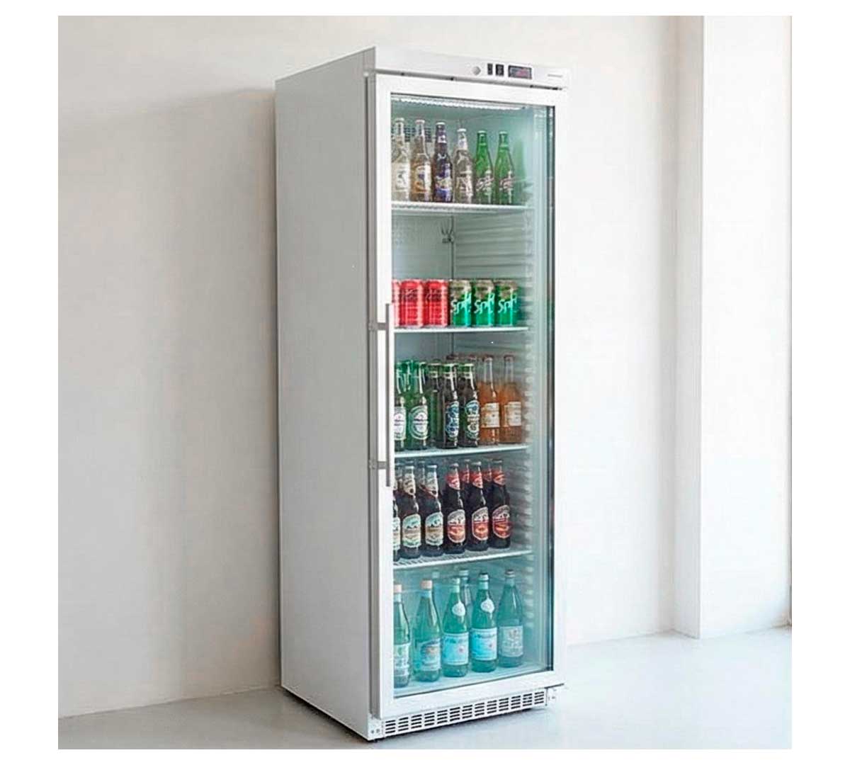 Armario expositor frigorífico con puerta de cristal y acabado exterior en acero epoxi blanco. La refrigeración es estática y el desescarche automático. Incluye 3 parrillas superiores y 1 parrilla para el espacio inferior. Tiene una capacidad de 460 litros.