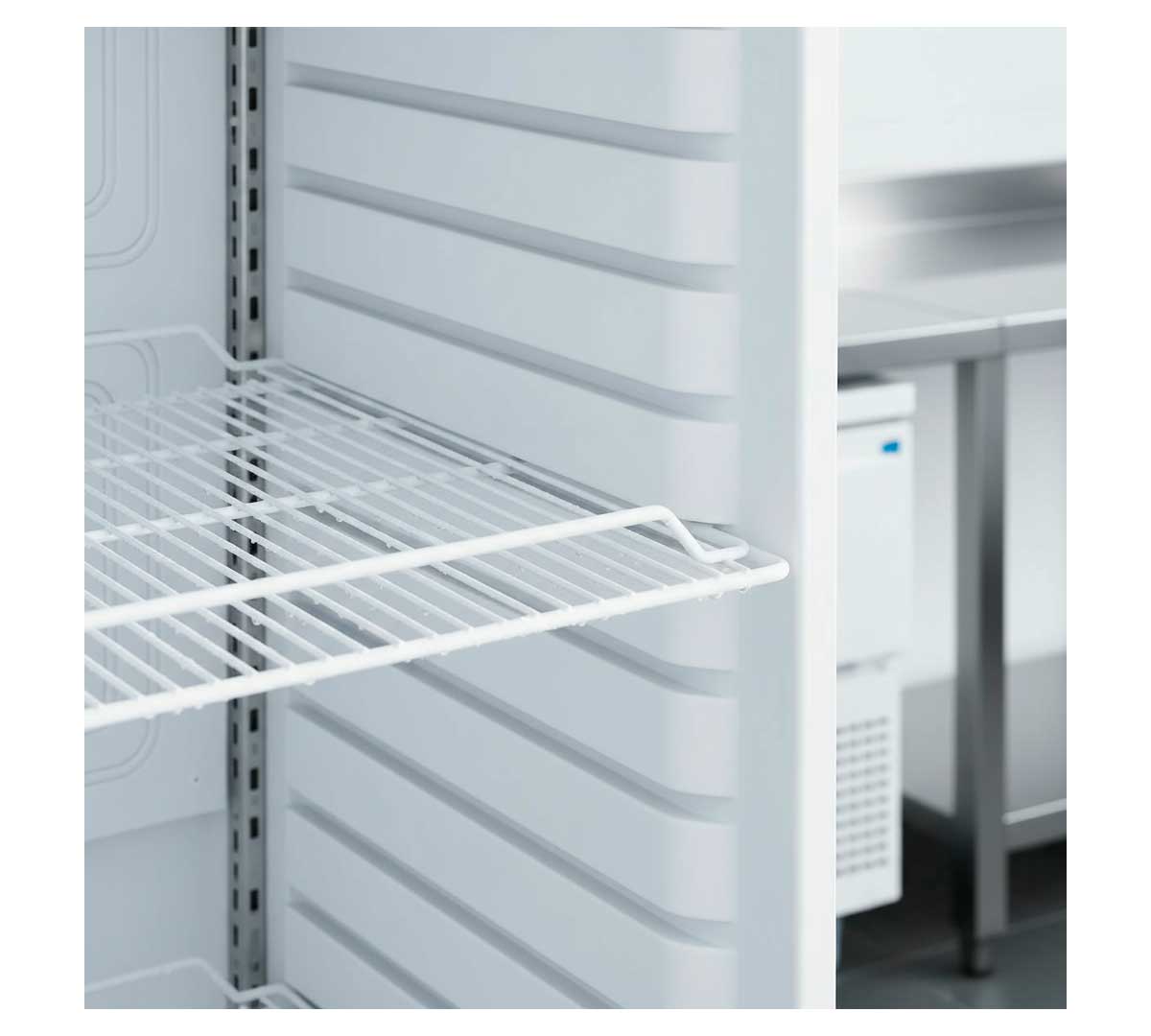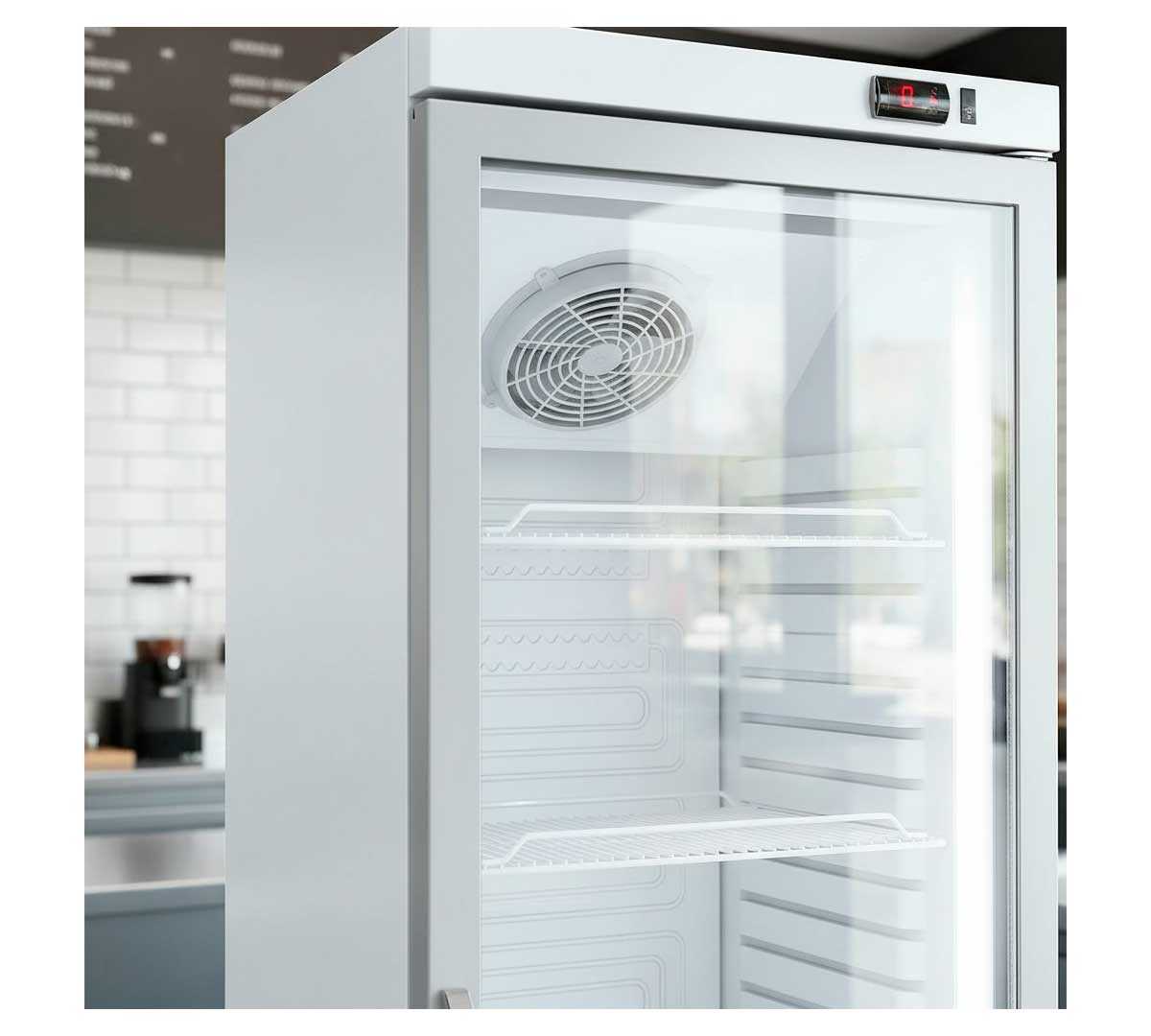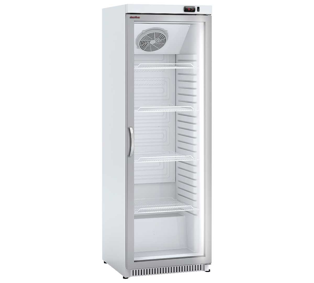 Expositor frigorífico vertical para bebidas. Está fabricado con exterior e interior en acero plastificado en color blanco. Dispone de iluminación en interior. Diseñado para bebidas y productos envasados. Tiene un rango de temperatura de 0 a +7 ºC.