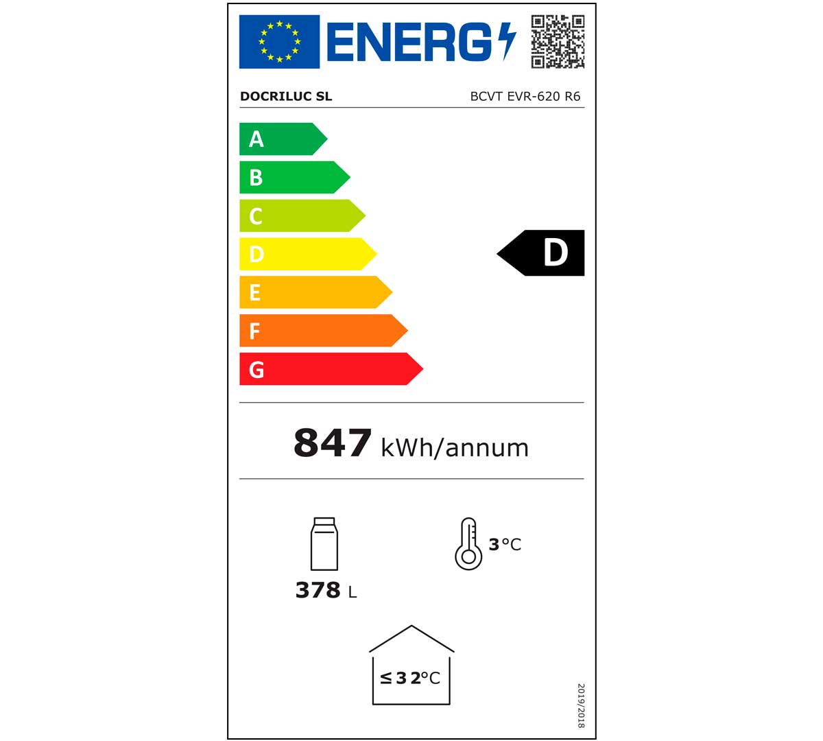 El congelador vertical EVR-620 tiene etiqueta de eficiencia energética clase D, según el reglamento UE 2019/2018.