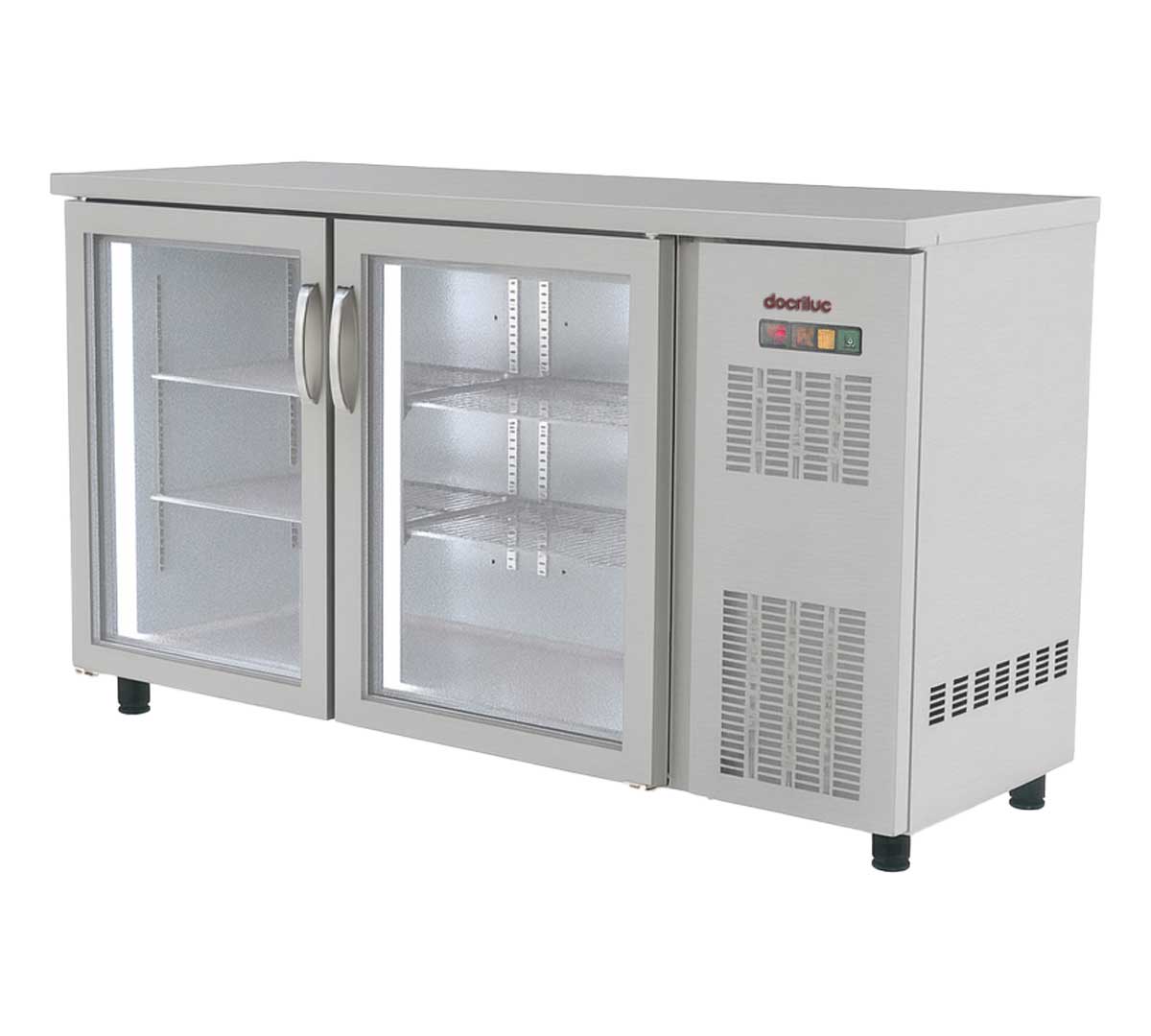 Armario expositor frigorífico diseñado para bebidas y productos envasados con 2 puertas. Tiene un diseño para encastrar bajo barra. Cuenta con doble acristalamiento, iluminación interior LED, control digital y aislamiento de poliuretano. El exterior está fabricado en acero inoxidable. Incluye 4 estantes.