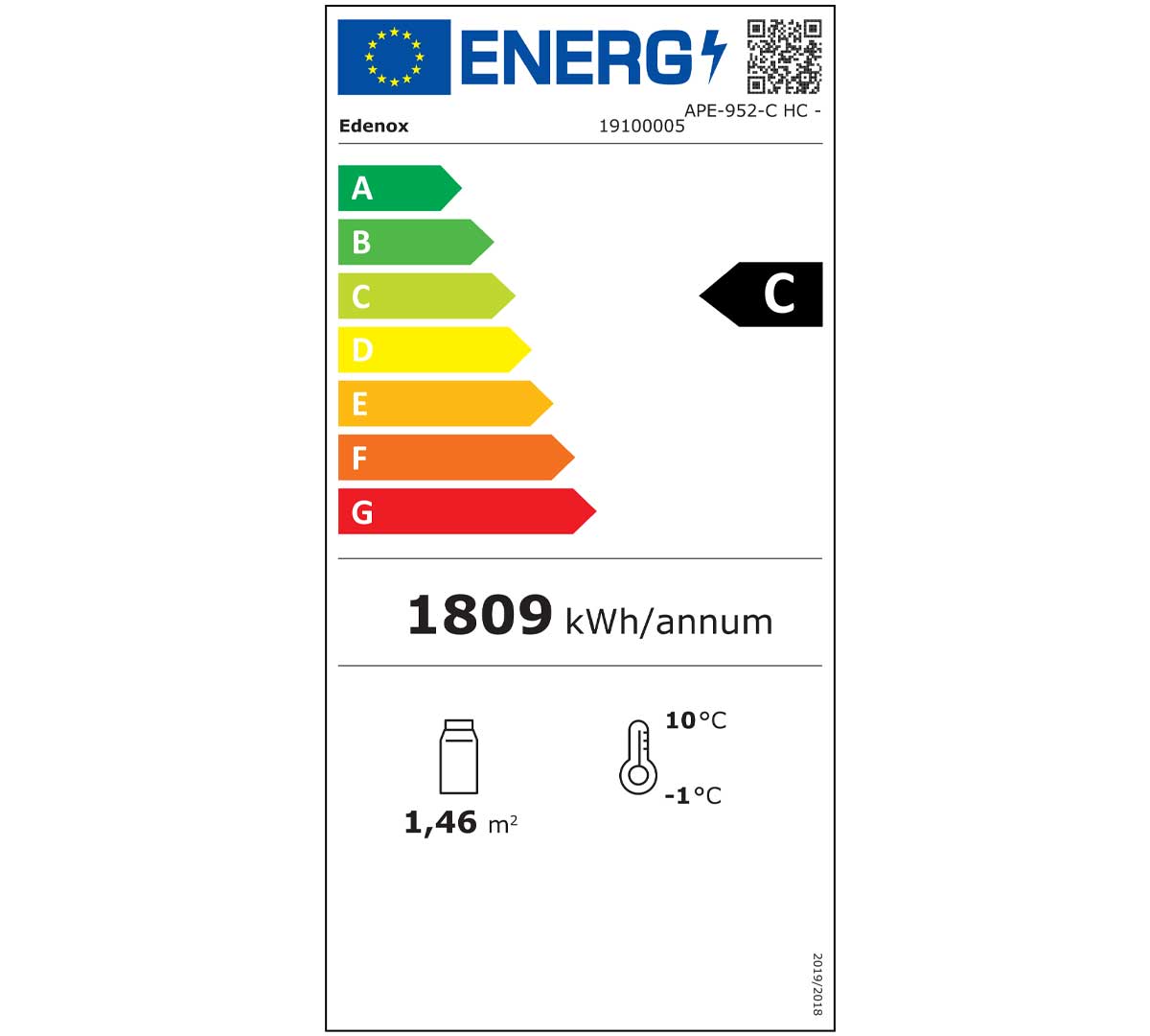 El armario refrigerado APE 952 C P HC BL tiene etiqueta de eficiencia energética clase C, según el reglamento UE 2019/2018.