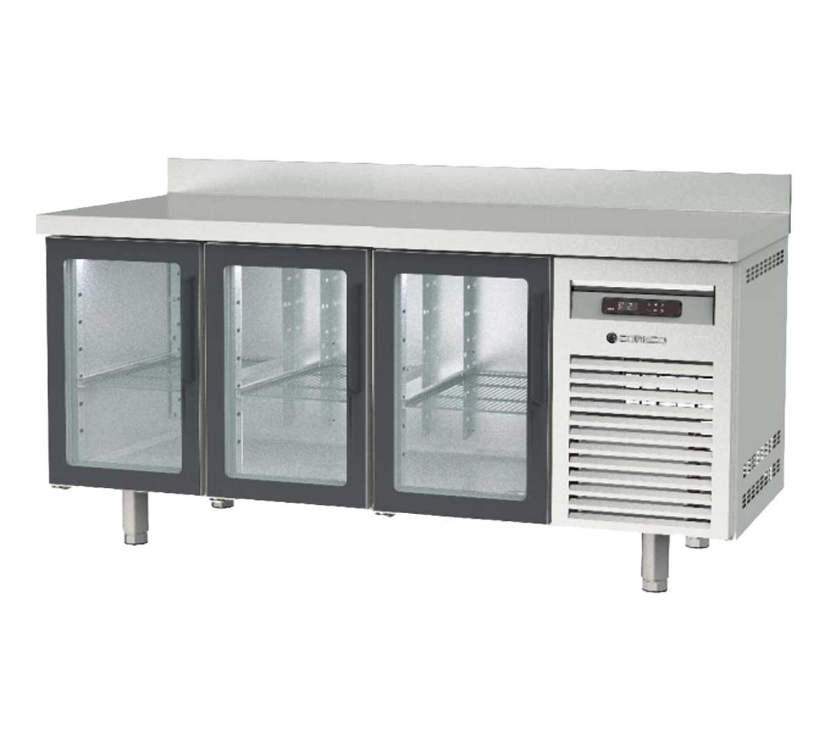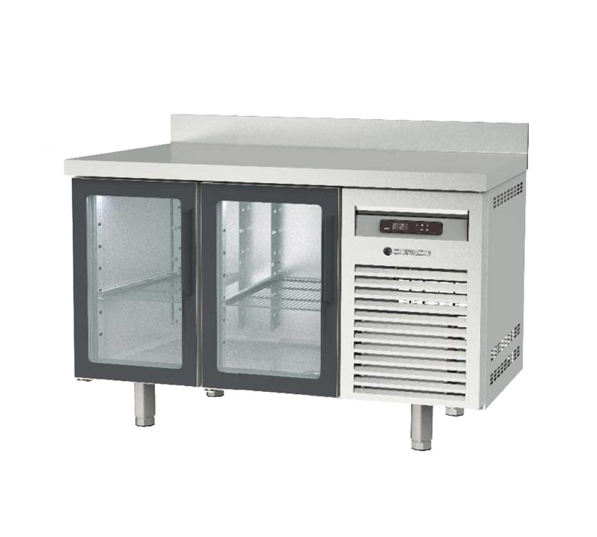Mesa de congelados con puertas de doble cristal. Dispone de aislamiento de poliuretano inyectado, puertas de apertura reversible y parrillas GN 1/1 regulables en altura. Tiene un rango de temperatura de -15 a -20 ºC.