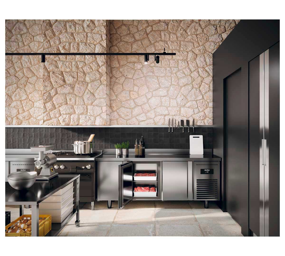 Es ideal como mesa de trabajo refrigerada en cocinas industriales, obradores y establecimientos que requieren accesibilidad y eficiencia en la gestión de productos congelados.