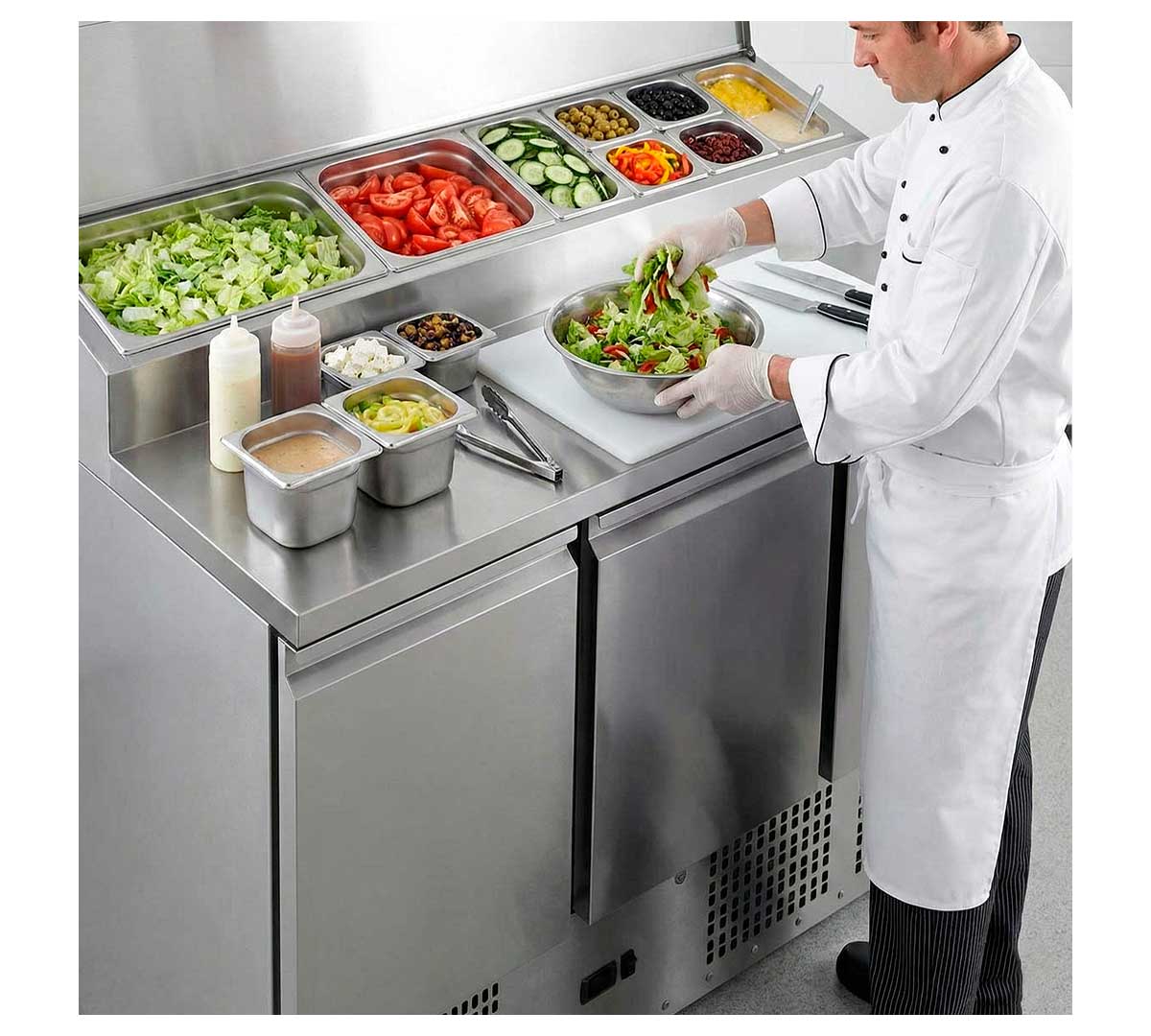 Mesa fría para preparación de ensaladas de la gama 700. Con encimera inox y expositor de ingredientes integrado con tapa. Tiene un rango de temperatura de 2 a 8 ºC. Incluye 1 estante y 1 conjunto de guías por cada puerta. Las cubetas gastronorm no están incluidas.